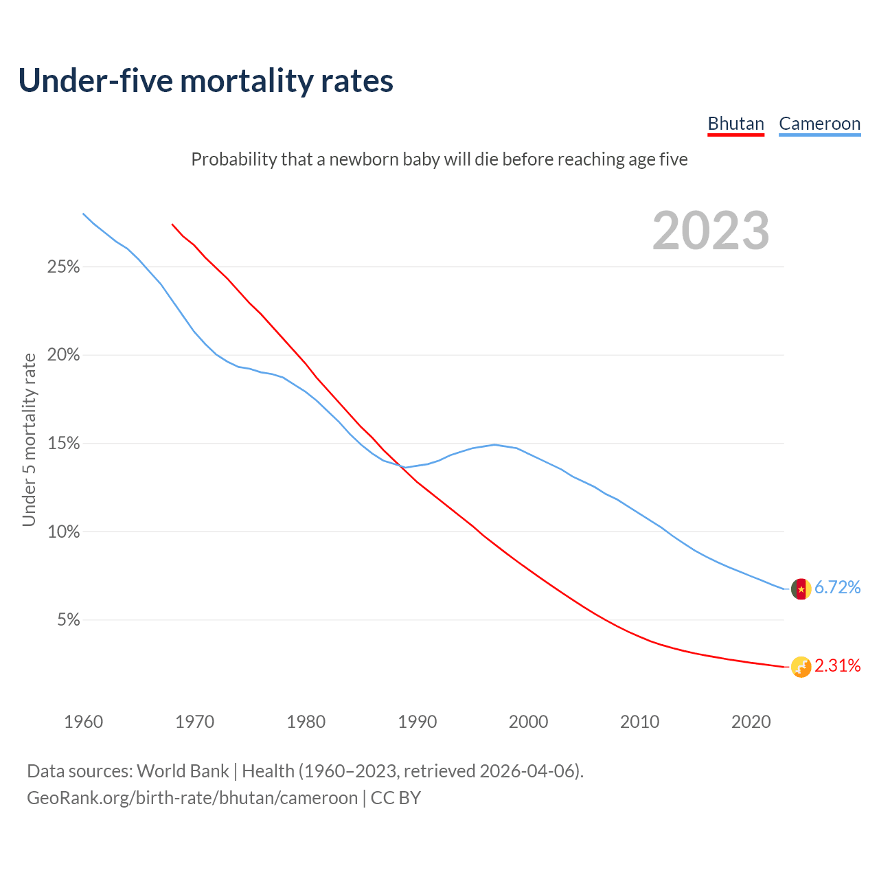 The chance that a newborn baby will die before reaching age five is 2.31% in Bhutan and 6.72% in Cameroon. Above is a chart with historical data on under-five mortality rates.