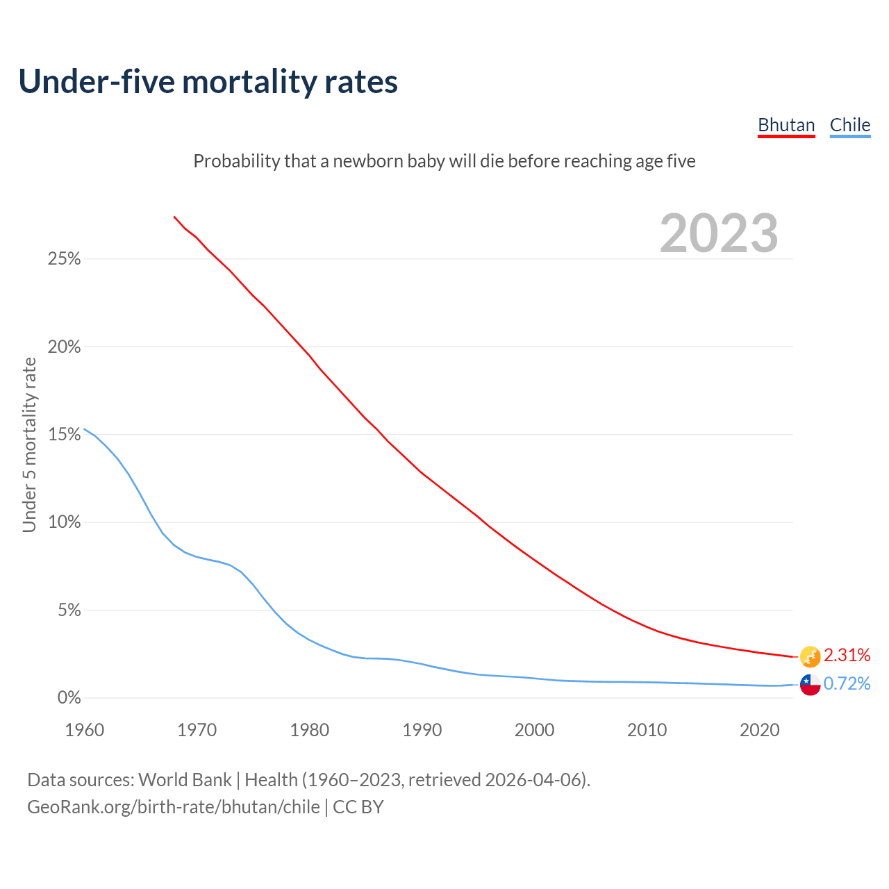 The chance that a newborn baby will die before reaching age five is 2.31% in Bhutan and 0.72% in Chile. Above is a chart with historical data on under-five mortality rates.