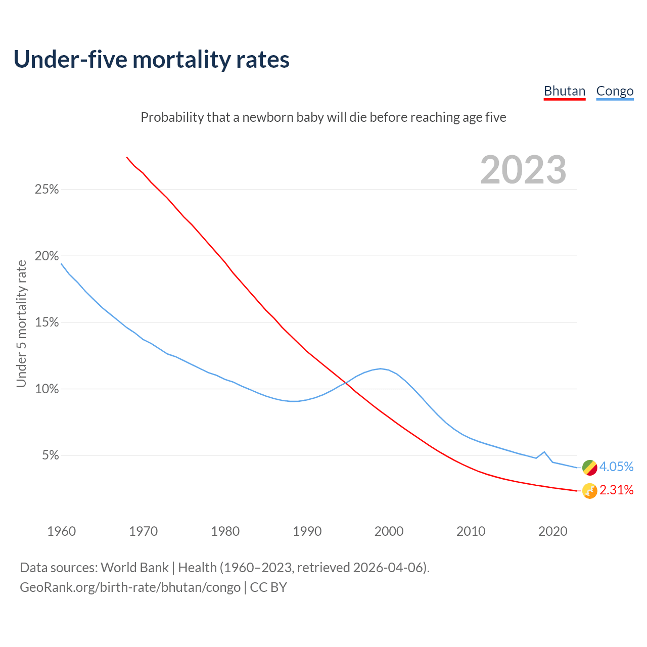 The chance that a newborn baby will die before reaching age five is 2.31% in Bhutan and 4.05% in the Congo. Above is a chart with historical data on under-five mortality rates.
