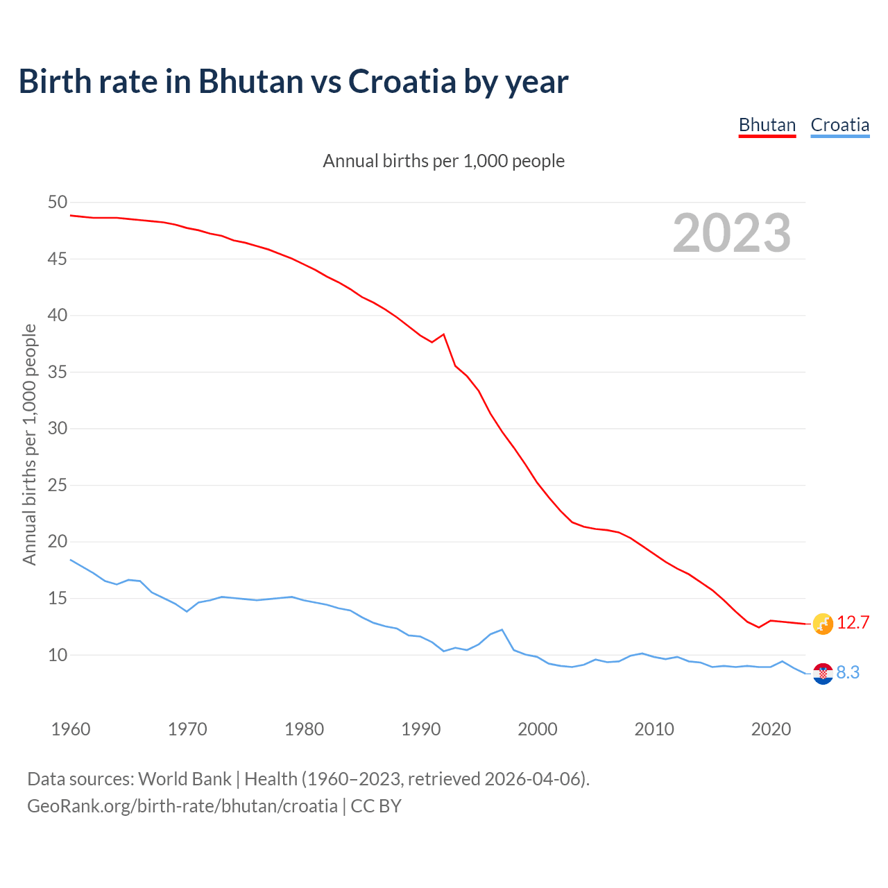 Bhutan has an annual birth rate of 12.7 births per 1,000 people, compared to 8.3 for Croatia. The average number of children a woman is expected to have during her lifetime — the fertility rate, is 1.46 in Bhutan and 1.46 in Croatia — 0.14% difference.