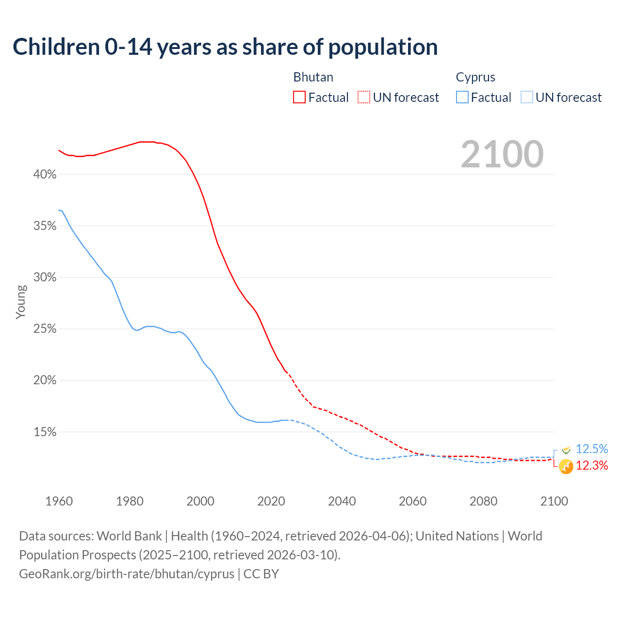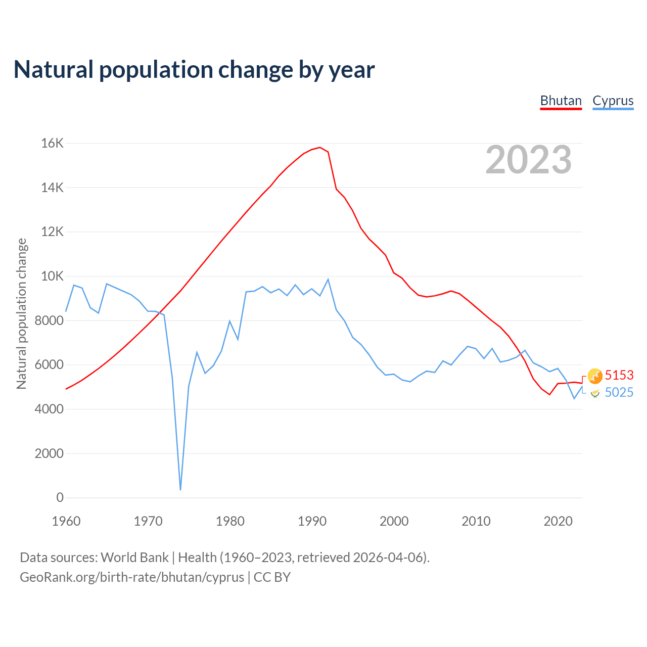 Bhutan has an annual birth rate of 12.7 births per 1,000 people, compared to 10.8 for Cyprus. The average number of children a woman is expected to have during her lifetime — the fertility rate, is 1.46 in Bhutan and 1.39 in Cyprus — 4.99% difference.