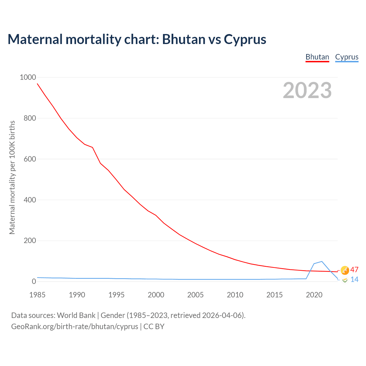 The maternal mortality rate, which is the probability of dying during childbirth or within 42 days of pregnancy termination, is 47 deaths per 100,000 live births in Bhutan, compared to 14 deaths in Cyprus.