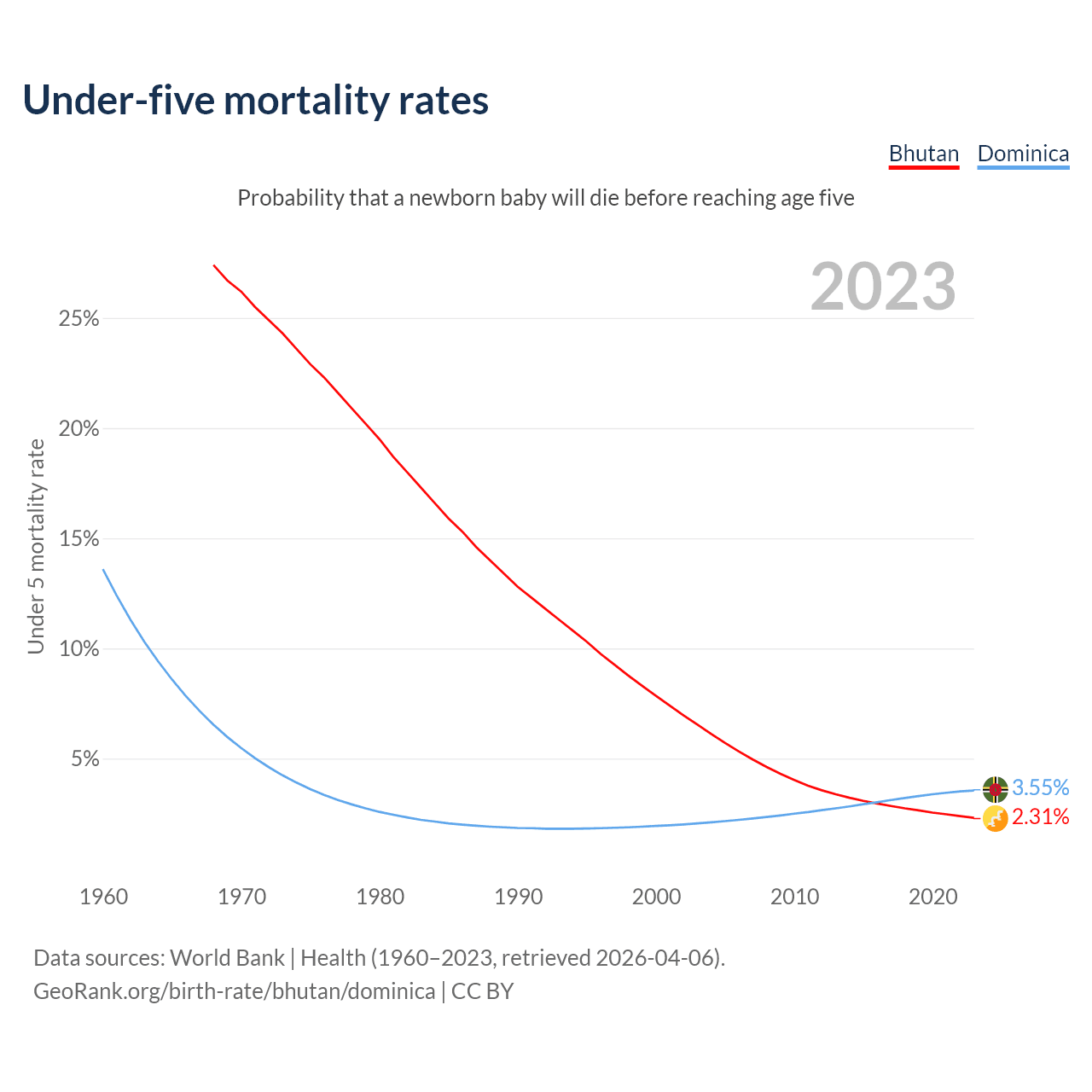 The chance that a newborn baby will die before reaching age five is 2.31% in Bhutan and 3.55% in Dominica. Above is a chart with historical data on under-five mortality rates.