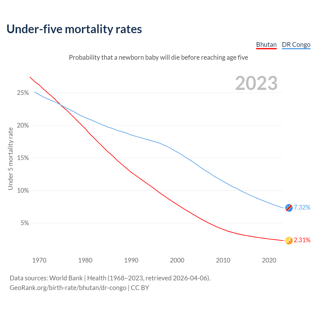 The chance that a newborn baby will die before reaching age five is 2.31% in Bhutan and 7.32% in the DR Congo. Above is a chart with historical data on under-five mortality rates.