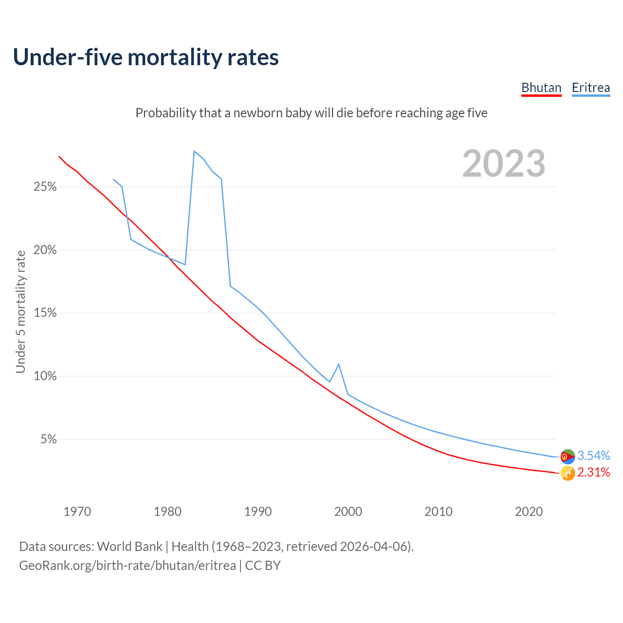 The chance that a newborn baby will die before reaching age five is 2.31% in Bhutan and 3.54% in Eritrea. Above is a chart with historical data on under-five mortality rates.