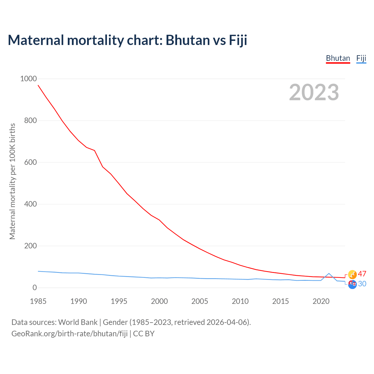 The maternal mortality rate, which is the probability of dying during childbirth or within 42 days of pregnancy termination, is 47 deaths per 100,000 live births in Bhutan, compared to 30 deaths in Fiji.