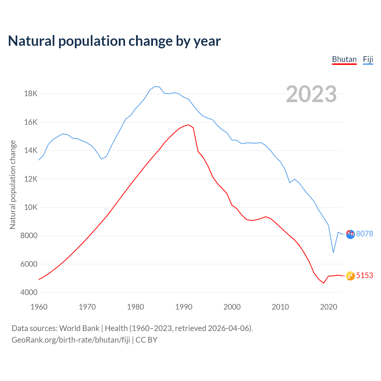 Bhutan has an annual birth rate of 12.7 births per 1,000 people, compared to 18 for Fiji. The average number of children a woman is expected to have during her lifetime — the fertility rate, is 1.46 in Bhutan and 2.28 in Fiji — 56% difference.