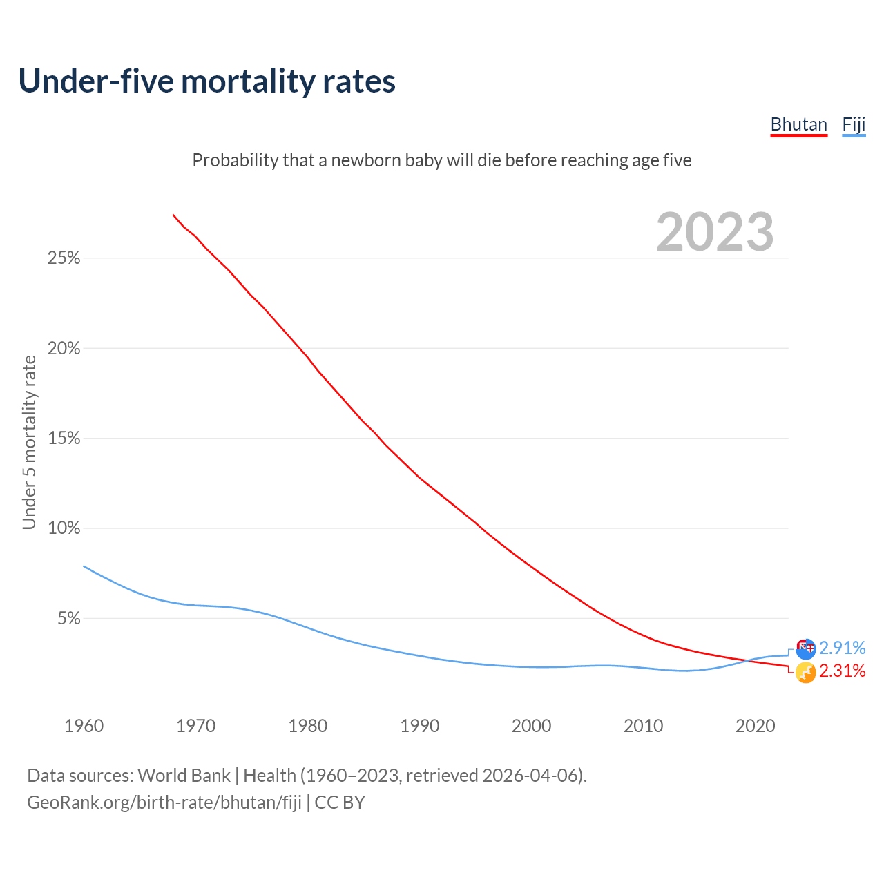 The chance that a newborn baby will die before reaching age five is 2.31% in Bhutan and 2.91% in Fiji. Above is a chart with historical data on under-five mortality rates.
