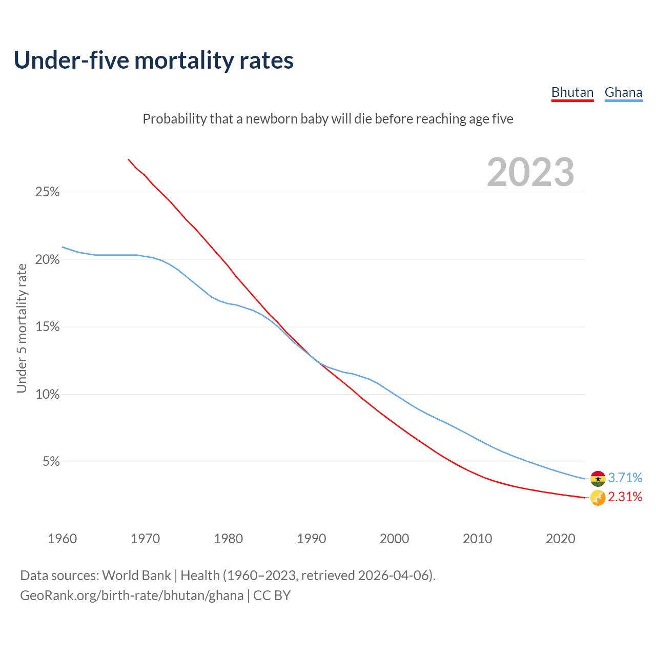 The chance that a newborn baby will die before reaching age five is 2.31% in Bhutan and 3.71% in Ghana. Above is a chart with historical data on under-five mortality rates.