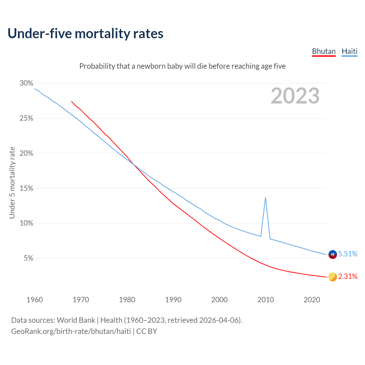 The chance that a newborn baby will die before reaching age five is 2.31% in Bhutan and 5.51% in Haiti. Above is a chart with historical data on under-five mortality rates.