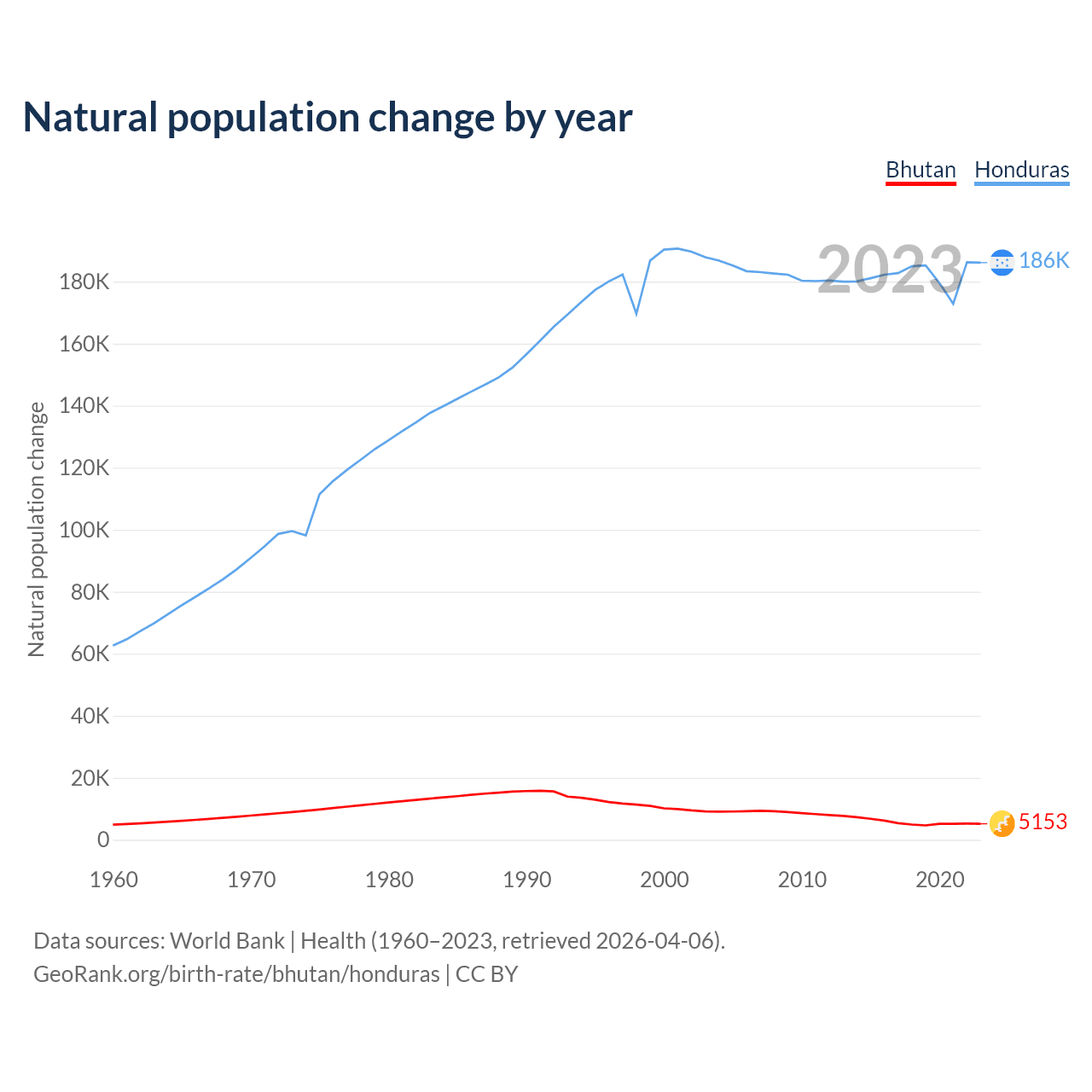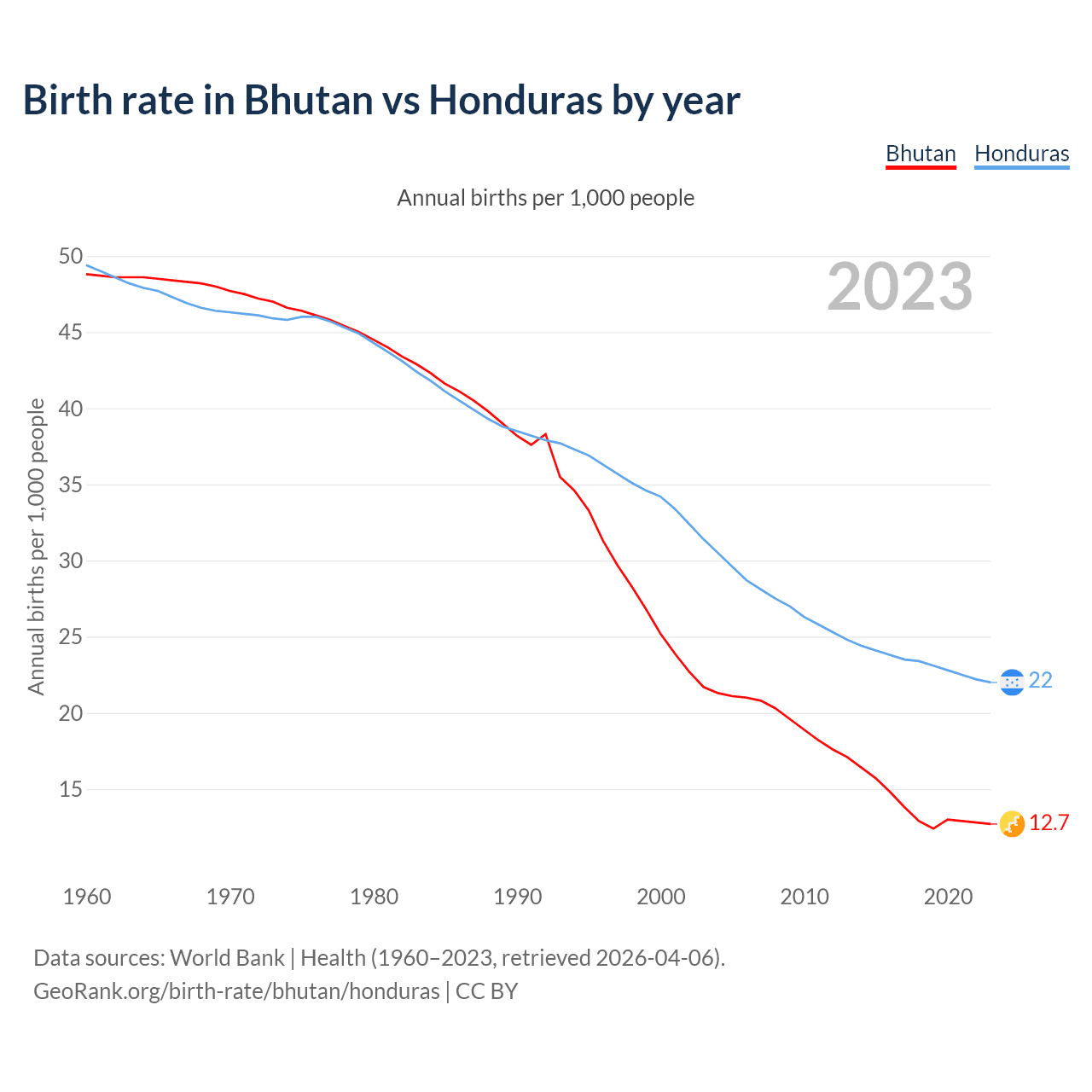 Bhutan has an annual birth rate of 12.7 births per 1,000 people, compared to 22 for Honduras. The average number of children a woman is expected to have during her lifetime — the fertility rate, is 1.46 in Bhutan and 2.5 in Honduras — 71% difference.