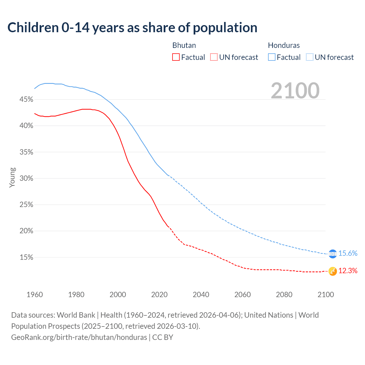 According to the latest available data on birth rates, the fertility rate in Bhutan was 1.46 children per woman in 2023, compared to 2.5 in Honduras in 2023. The replacement level is considered to be 2.1 children per woman.