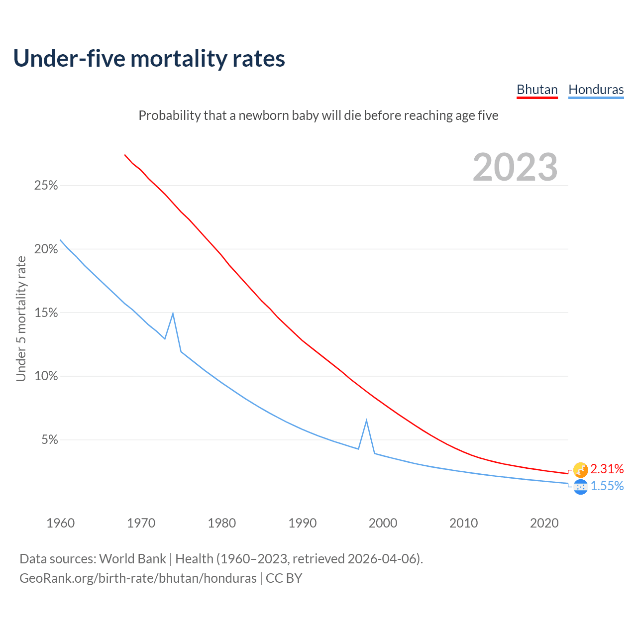 The chance that a newborn baby will die before reaching age five is 2.31% in Bhutan and 1.55% in Honduras. Above is a chart with historical data on under-five mortality rates.
