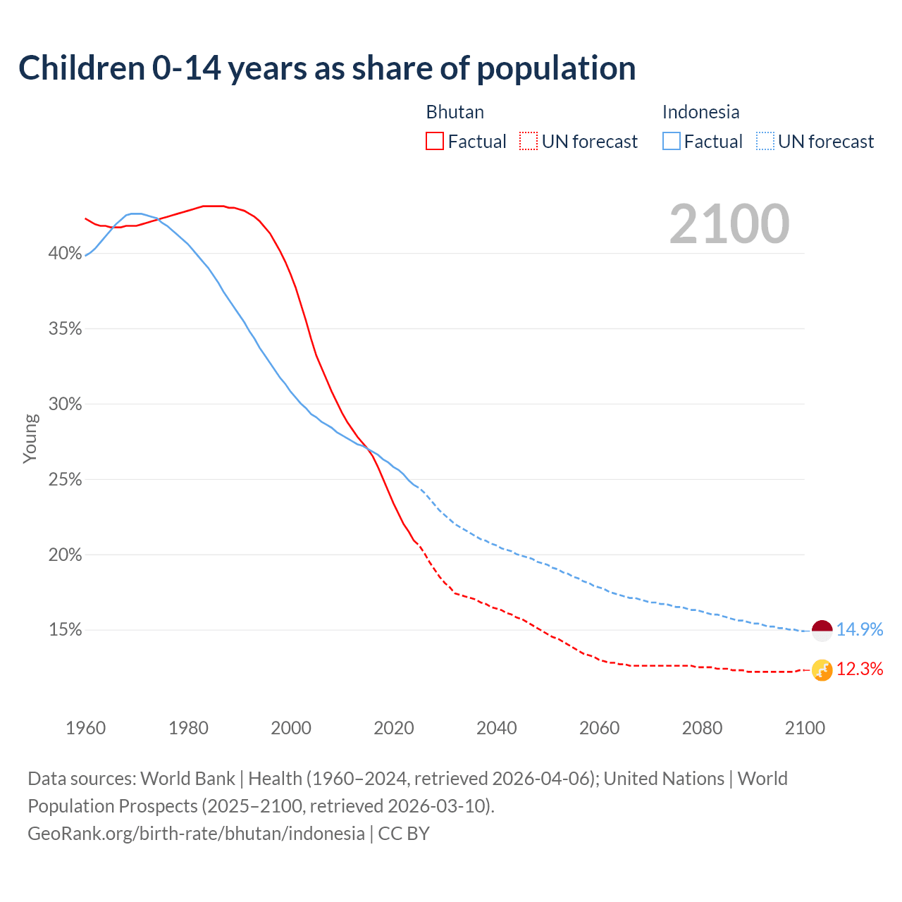 According to the latest available data on birth rates, the fertility rate in Bhutan was 1.46 children per woman in 2023, compared to 2.13 in Indonesia in 2023. The replacement level is considered to be 2.1 children per woman.