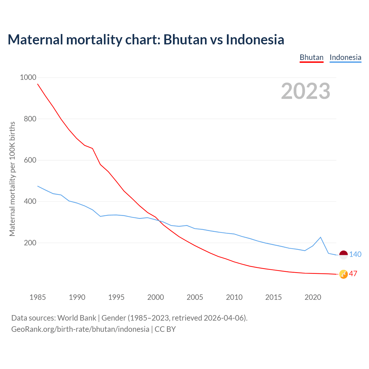 The maternal mortality rate, which is the probability of dying during childbirth or within 42 days of pregnancy termination, is 47 deaths per 100,000 live births in Bhutan, compared to 140 deaths in Indonesia.