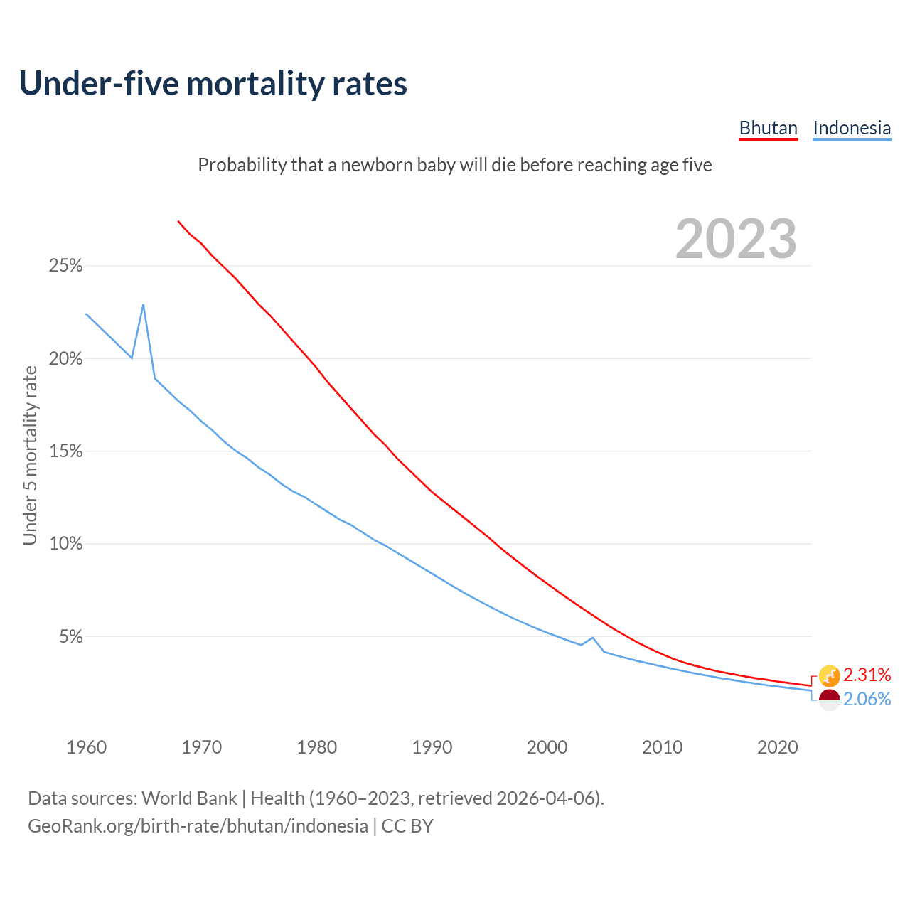 The chance that a newborn baby will die before reaching age five is 2.31% in Bhutan and 2.06% in Indonesia. Above is a chart with historical data on under-five mortality rates.