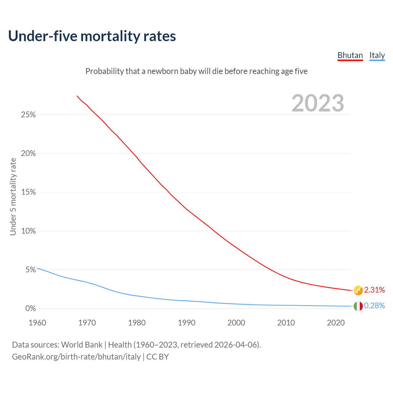 The chance that a newborn baby will die before reaching age five is 2.31% in Bhutan and 0.28% in Italy. Above is a chart with historical data on under-five mortality rates.