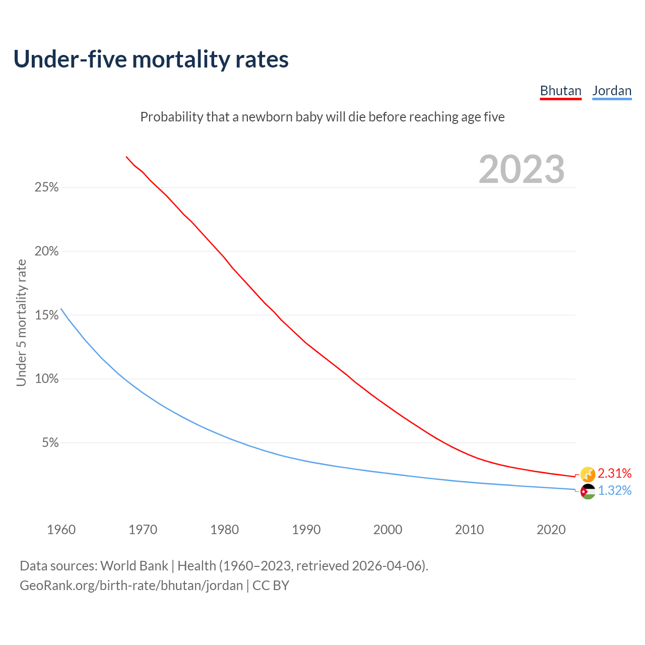 The chance that a newborn baby will die before reaching age five is 2.31% in Bhutan and 1.32% in Jordan. Above is a chart with historical data on under-five mortality rates.