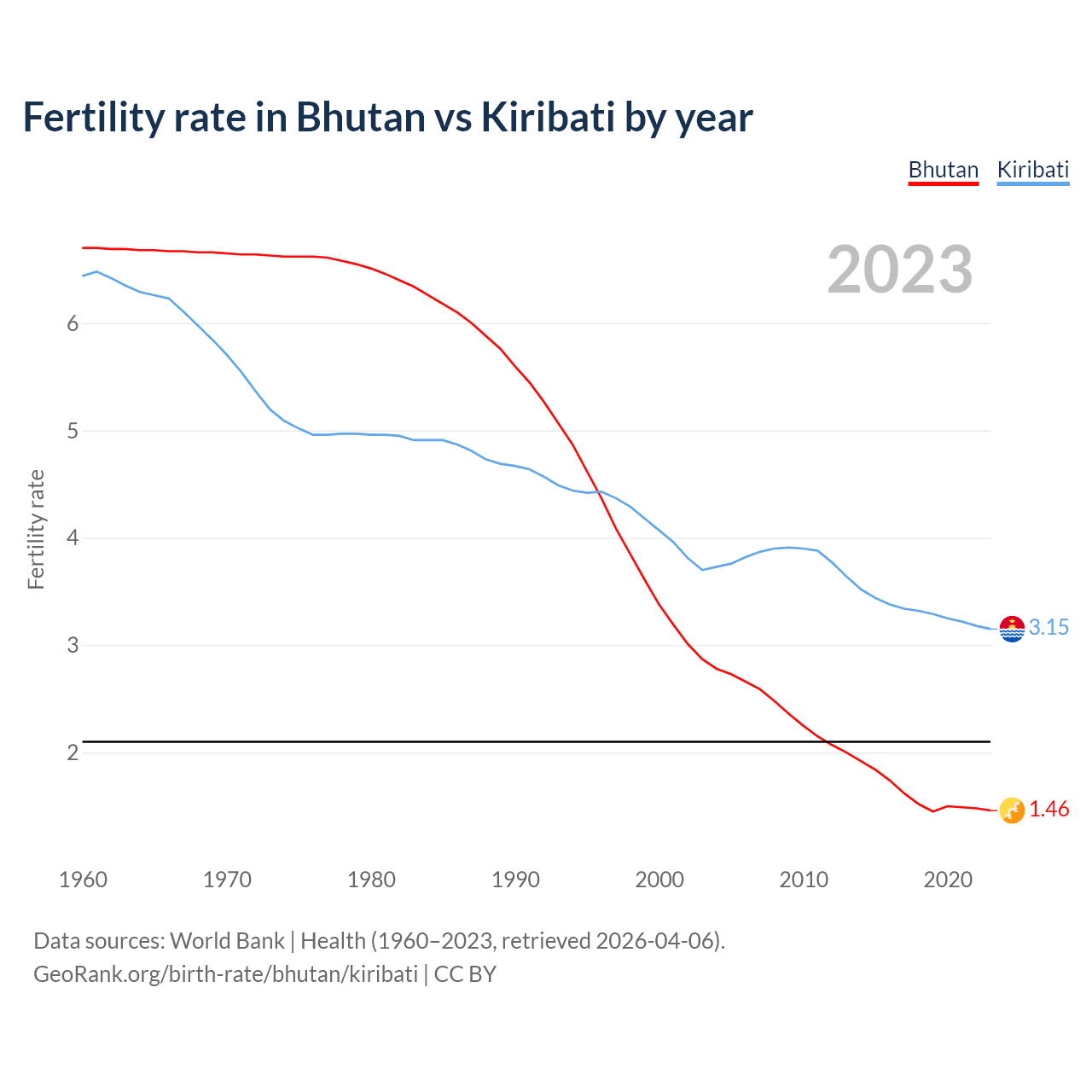 According to the latest available data on birth rates, the fertility rate in Bhutan was 1.46 children per woman in 2023, compared to 3.15 in Kiribati in 2023. The replacement level is considered to be 2.1 children per woman.