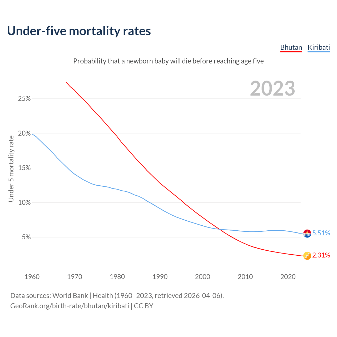 The chance that a newborn baby will die before reaching age five is 2.31% in Bhutan and 5.51% in Kiribati. Above is a chart with historical data on under-five mortality rates.
