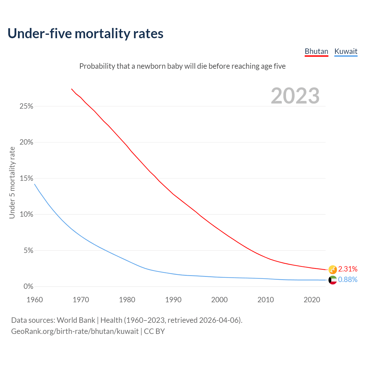 The chance that a newborn baby will die before reaching age five is 2.31% in Bhutan and 0.88% in Kuwait. Above is a chart with historical data on under-five mortality rates.