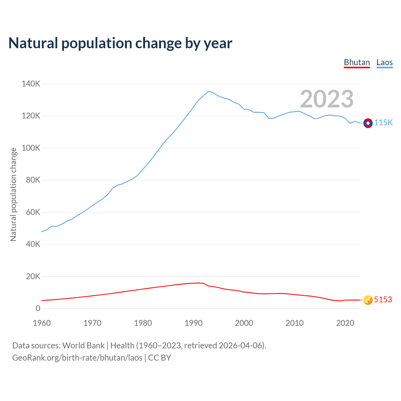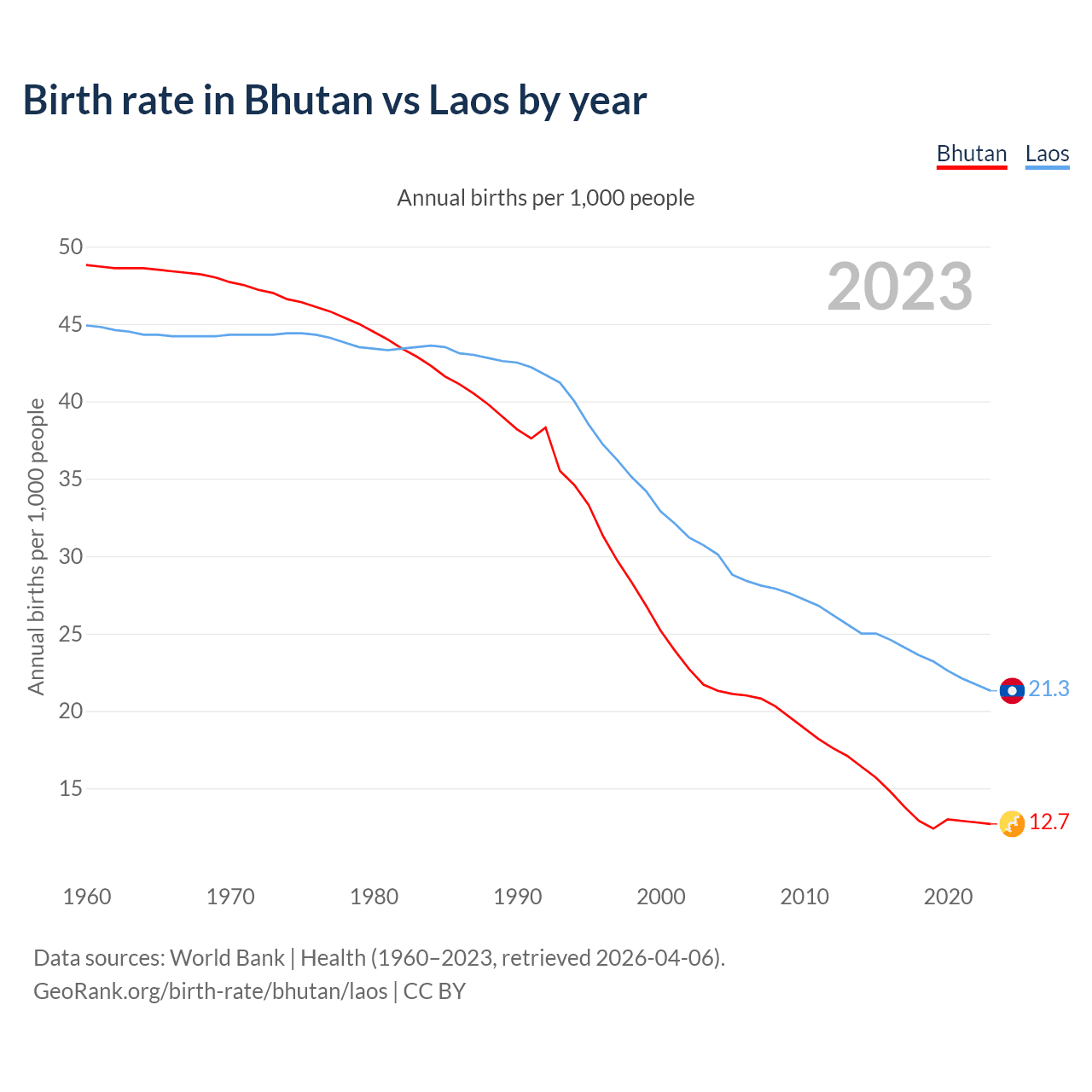 Bhutan has an annual birth rate of 12.7 births per 1,000 people, compared to 21.3 for Laos. The average number of children a woman is expected to have during her lifetime — the fertility rate, is 1.46 in Bhutan and 2.42 in Laos — 65.6% difference.