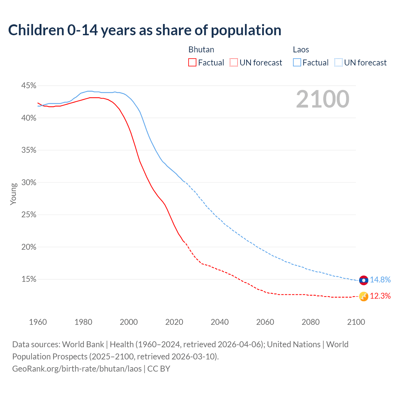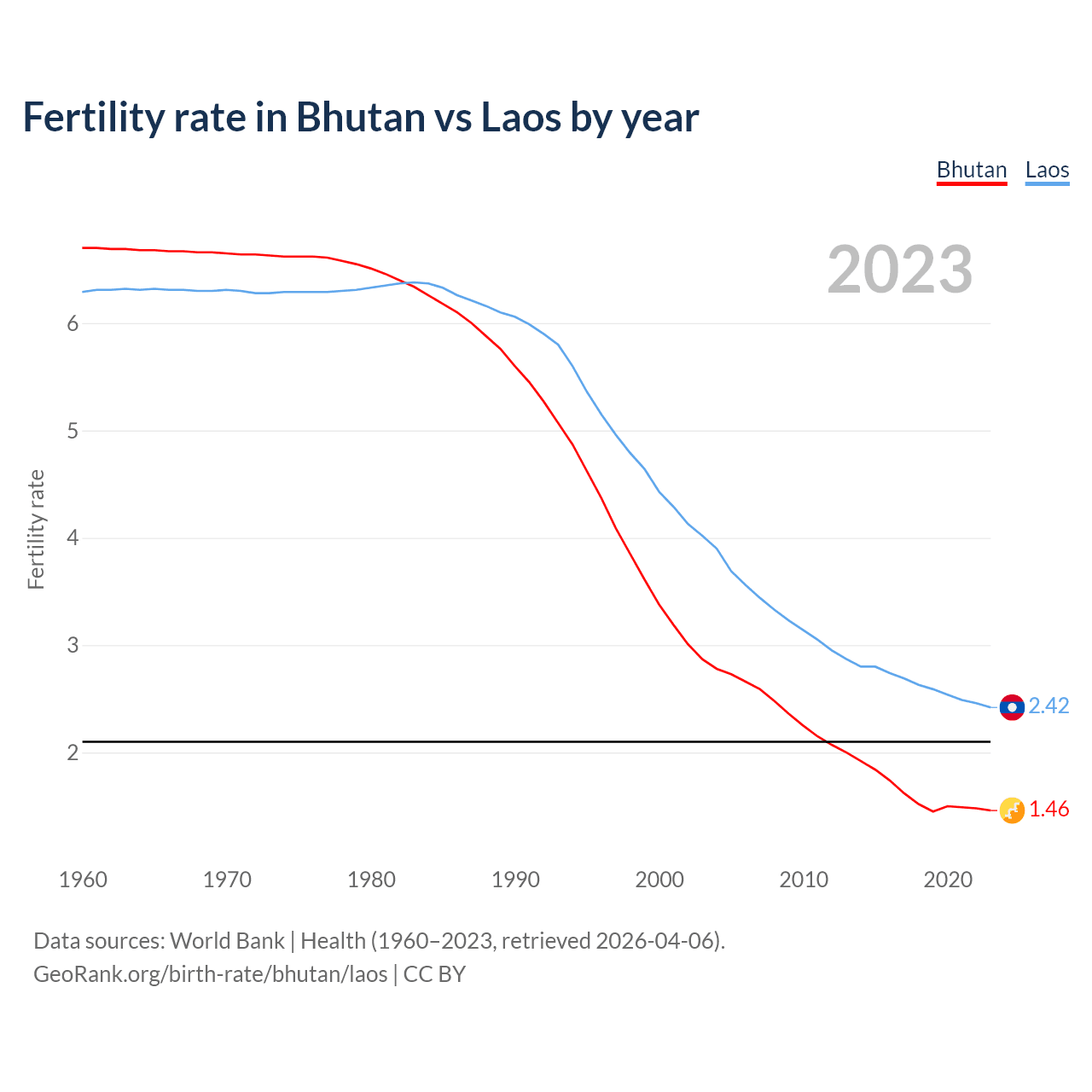 According to the latest available data on birth rates, the fertility rate in Bhutan was 1.46 children per woman in 2023, compared to 2.42 in Laos in 2023. The replacement level is considered to be 2.1 children per woman.