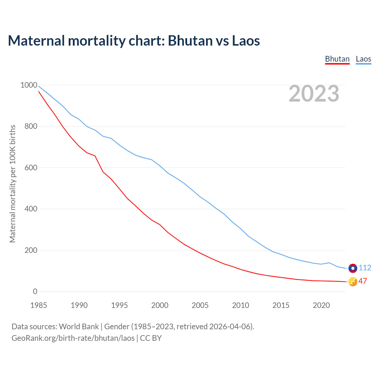 The maternal mortality rate, which is the probability of dying during childbirth or within 42 days of pregnancy termination, is 47 deaths per 100,000 live births in Bhutan, compared to 112 deaths in Laos.