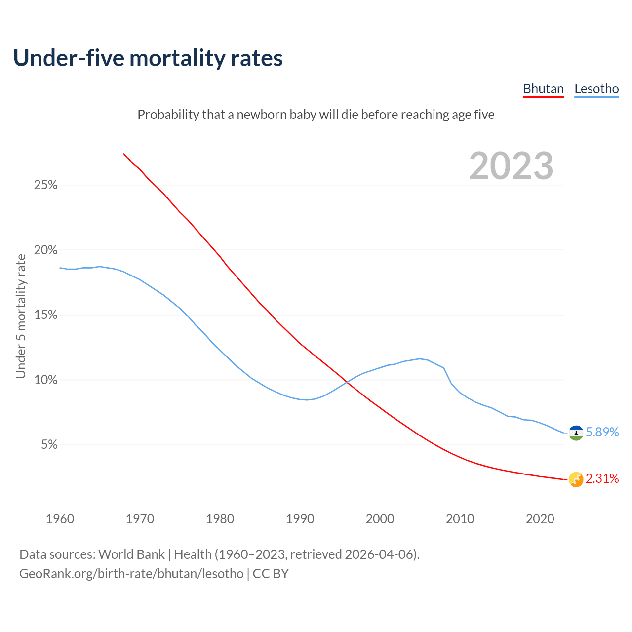 The chance that a newborn baby will die before reaching age five is 2.31% in Bhutan and 5.89% in Lesotho. Above is a chart with historical data on under-five mortality rates.