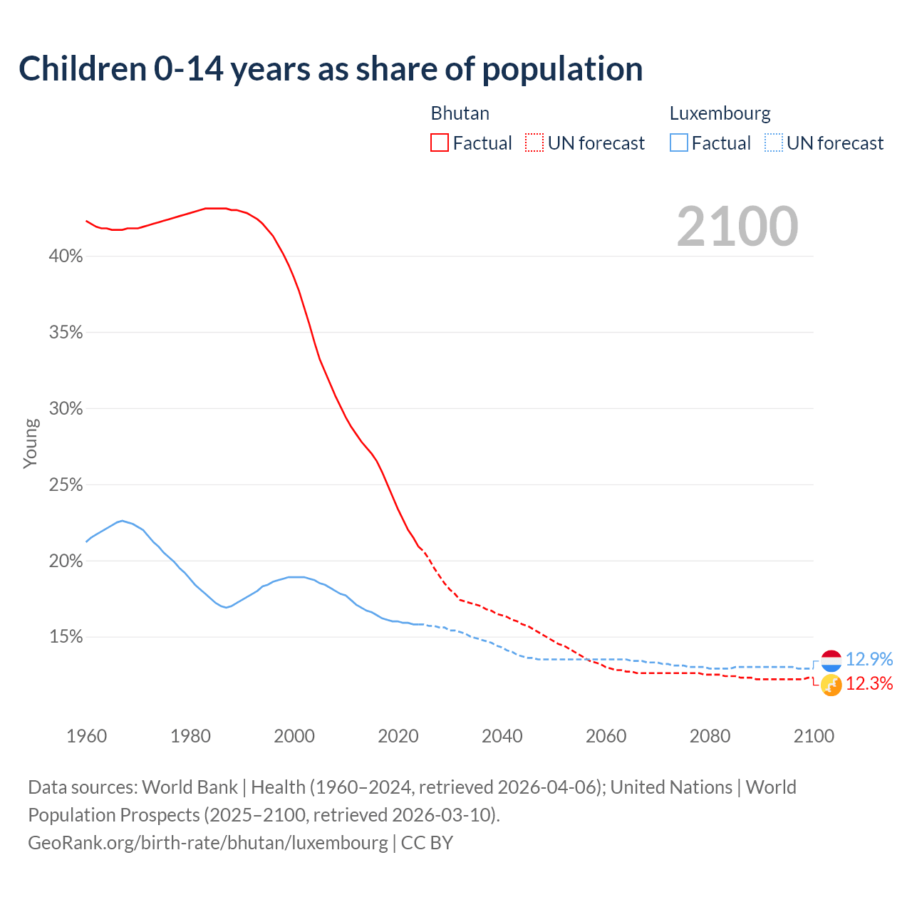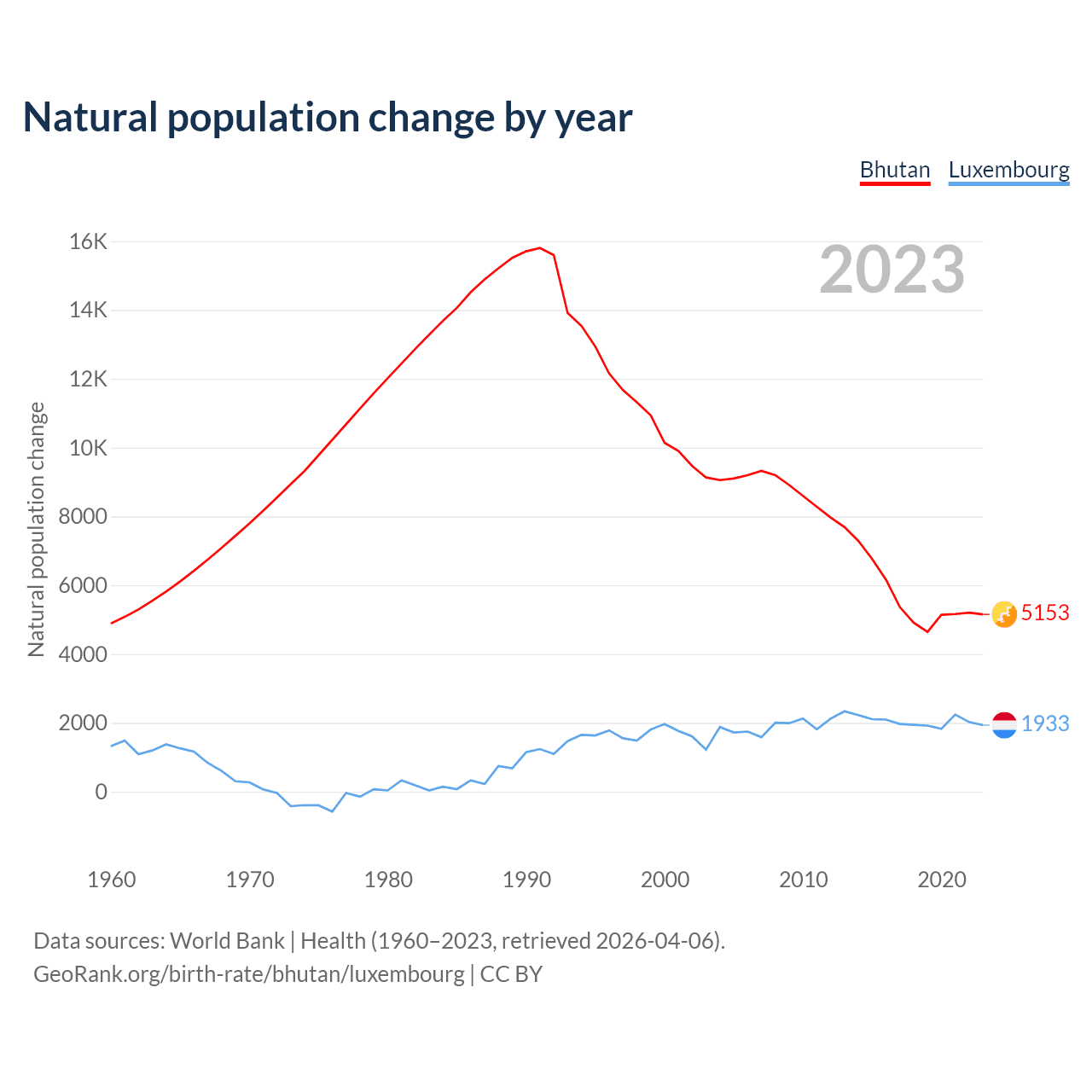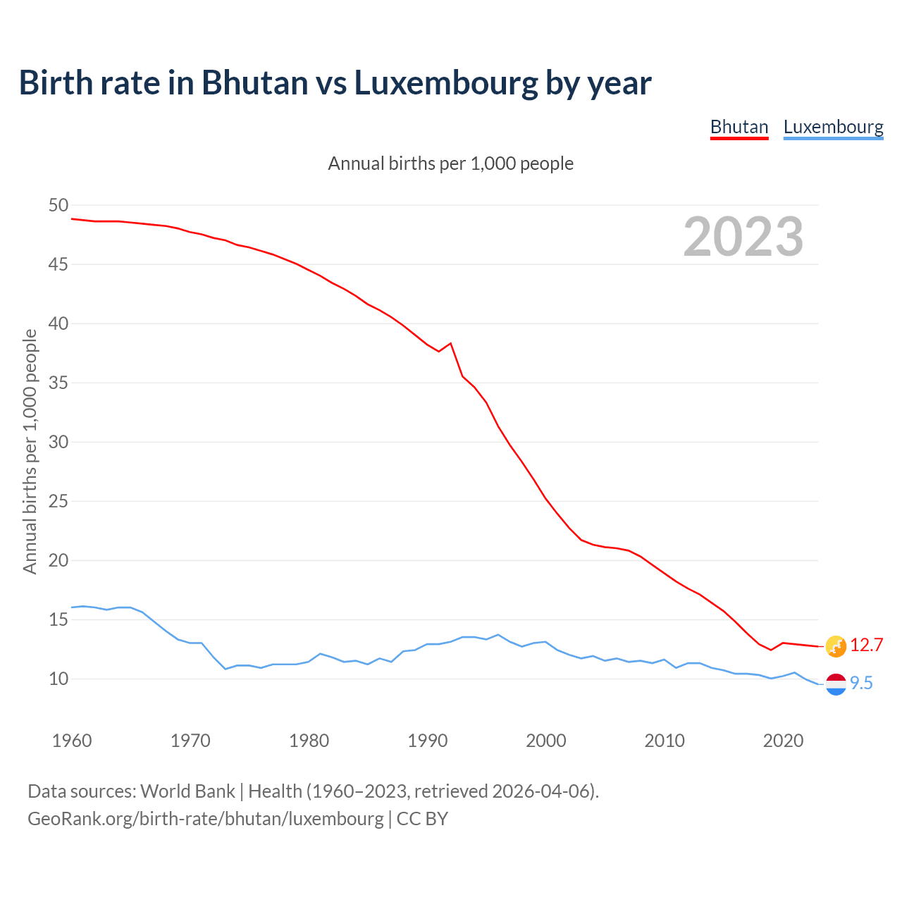 Bhutan has an annual birth rate of 12.7 births per 1,000 people, compared to 9.5 for Luxembourg. The average number of children a woman is expected to have during her lifetime — the fertility rate, is 1.46 in Bhutan and 1.25 in Luxembourg — 14.5% difference.