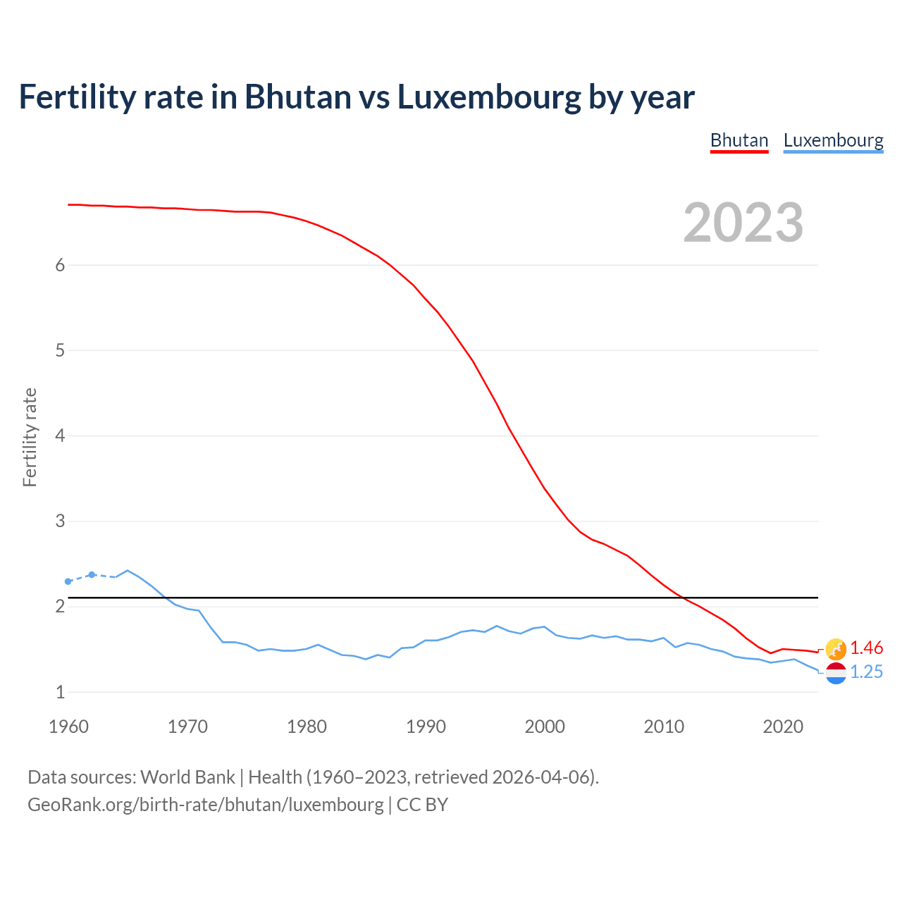 According to the latest available data on birth rates, the fertility rate in Bhutan was 1.46 children per woman in 2023, compared to 1.25 in Luxembourg in 2023. The replacement level is considered to be 2.1 children per woman.