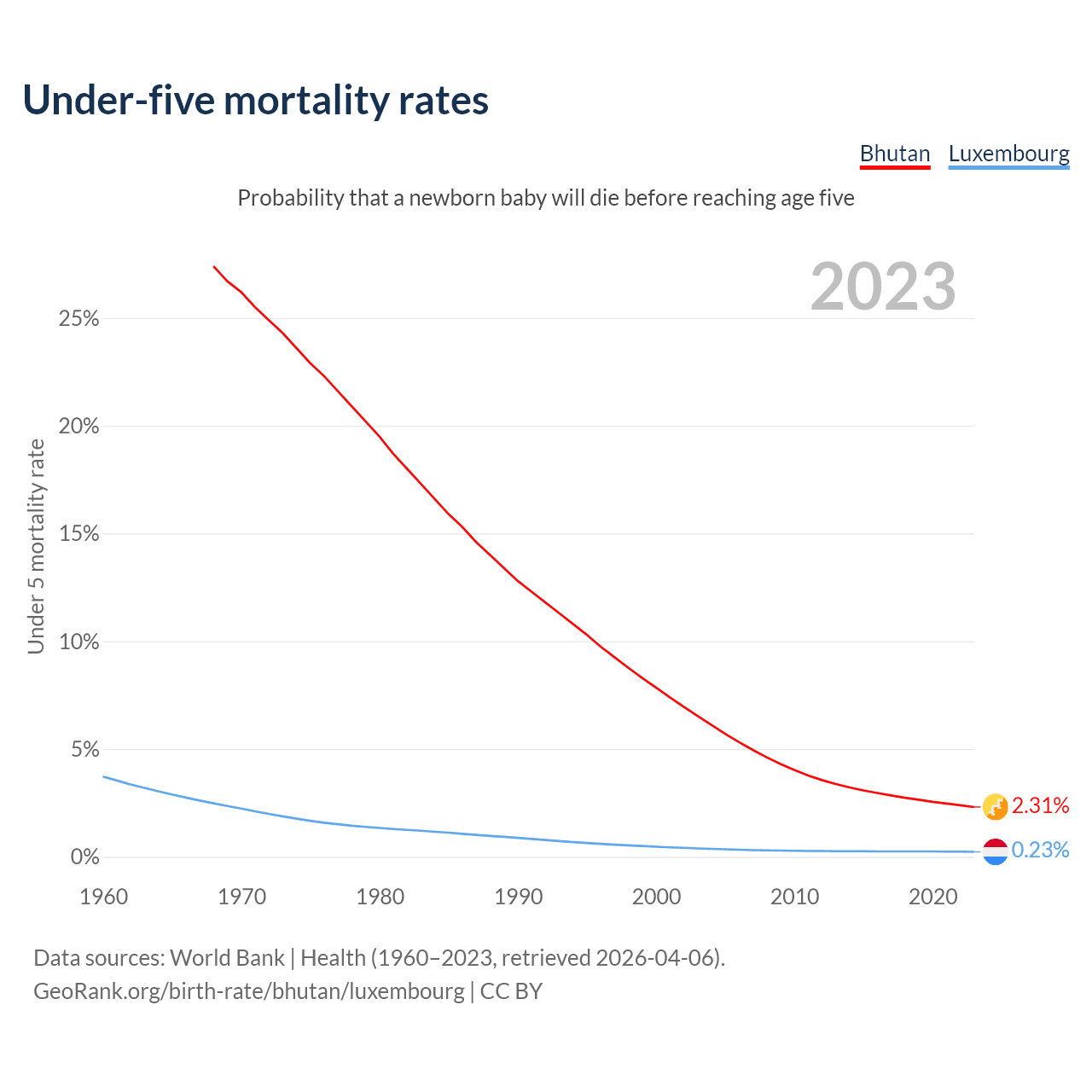 The chance that a newborn baby will die before reaching age five is 2.31% in Bhutan and 0.23% in Luxembourg. Above is a chart with historical data on under-five mortality rates.