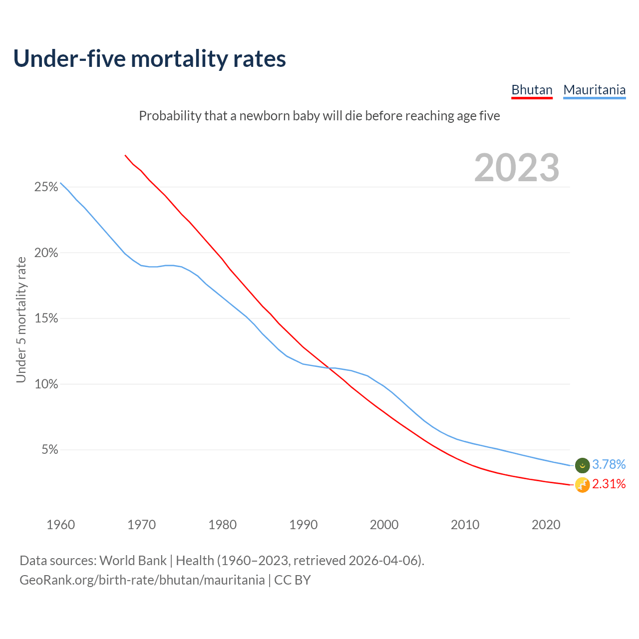 The chance that a newborn baby will die before reaching age five is 2.31% in Bhutan and 3.78% in Mauritania. Above is a chart with historical data on under-five mortality rates.