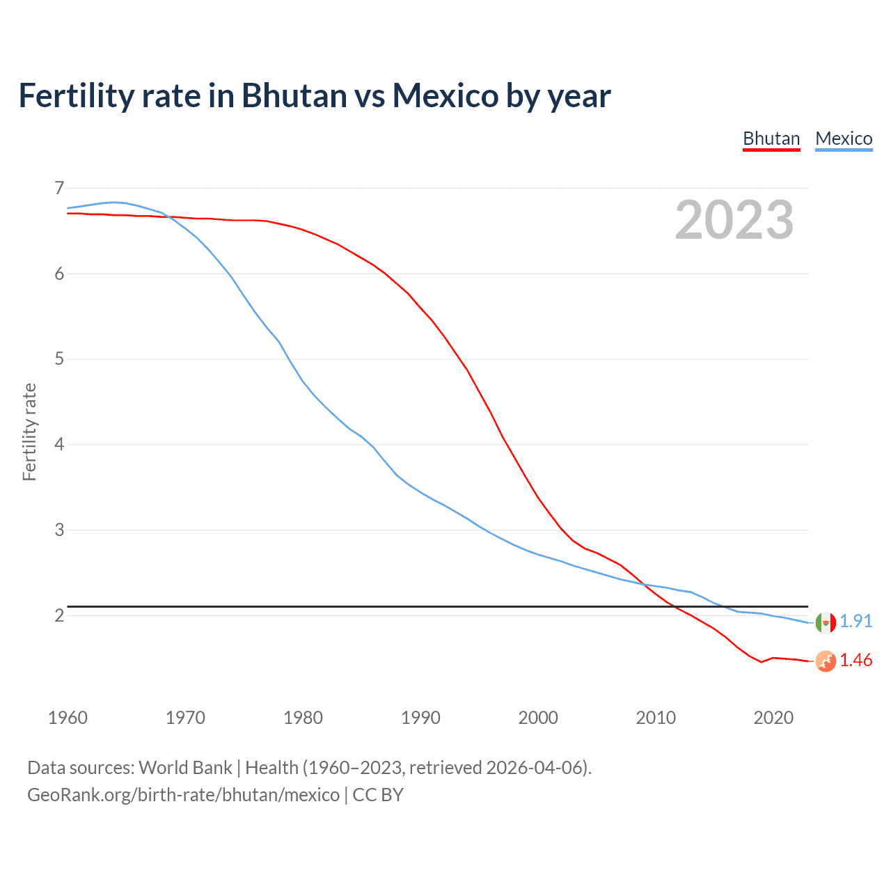 1960 vs 2023, the fertility rate has decreased by 78.2% in Bhutan and by 71.8% in Mexico — in 1960, it was 6.7 and 6.76, respectively.