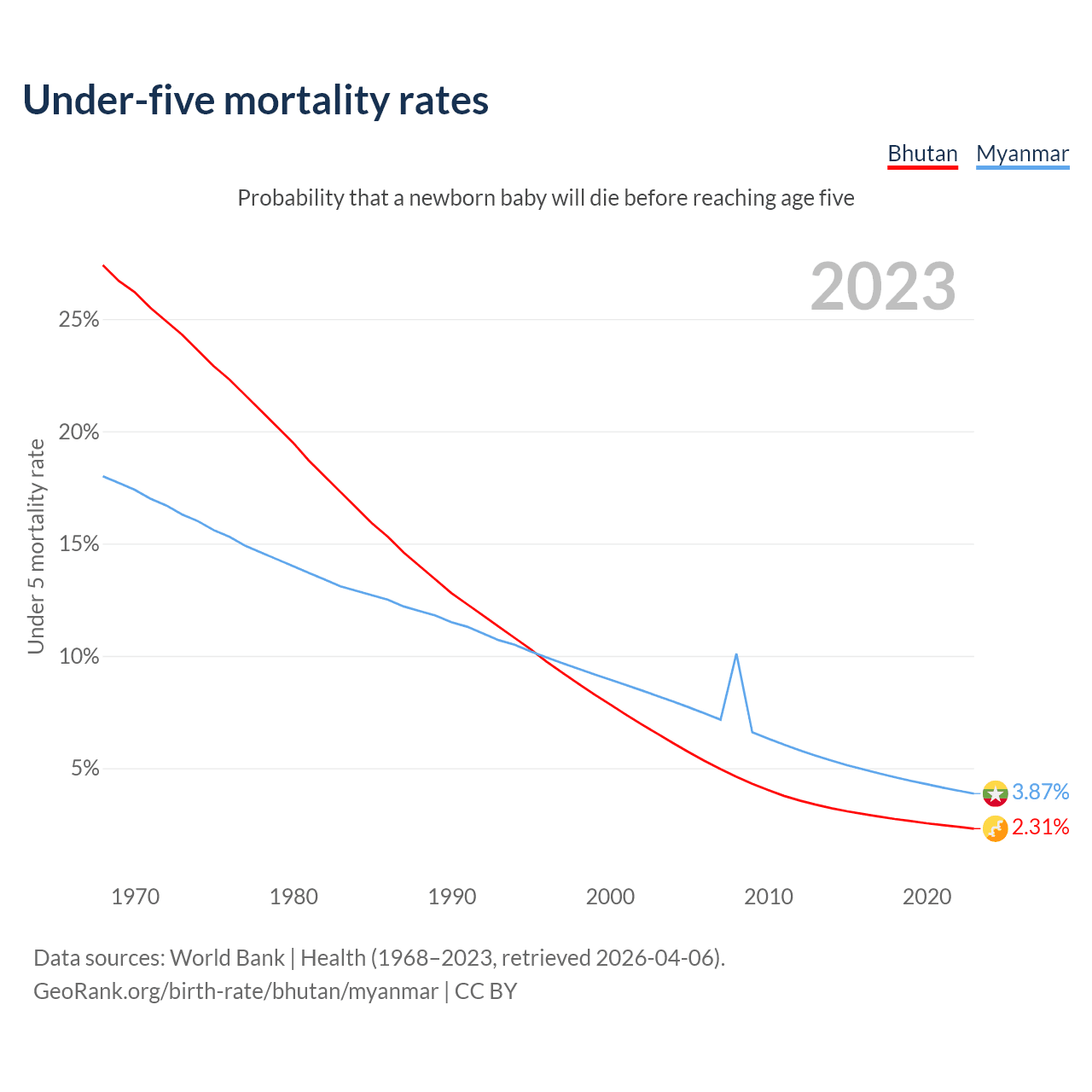 The chance that a newborn baby will die before reaching age five is 2.31% in Bhutan and 3.87% in Myanmar. Above is a chart with historical data on under-five mortality rates.