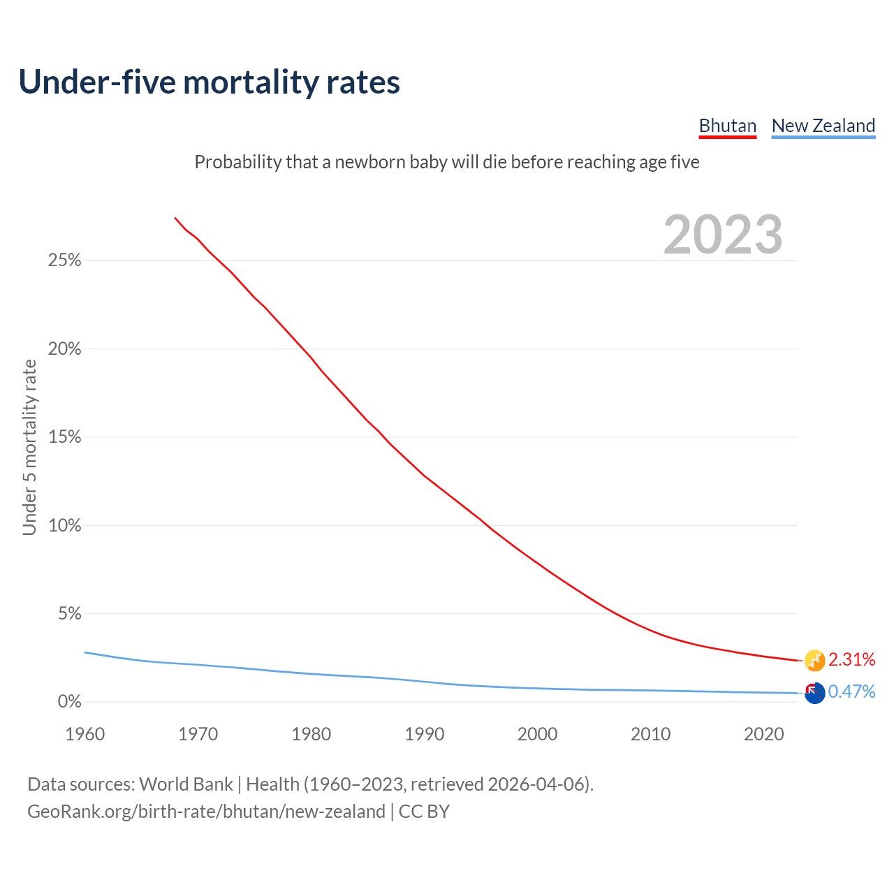 The chance that a newborn baby will die before reaching age five is 2.31% in Bhutan and 0.47% in New Zealand. Above is a chart with historical data on under-five mortality rates.