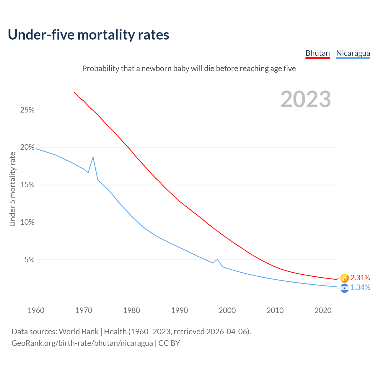 The chance that a newborn baby will die before reaching age five is 2.31% in Bhutan and 1.34% in Nicaragua. Above is a chart with historical data on under-five mortality rates.