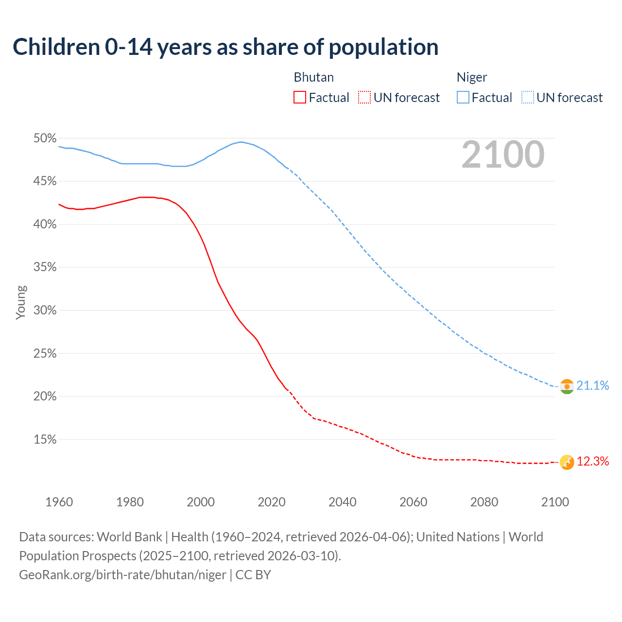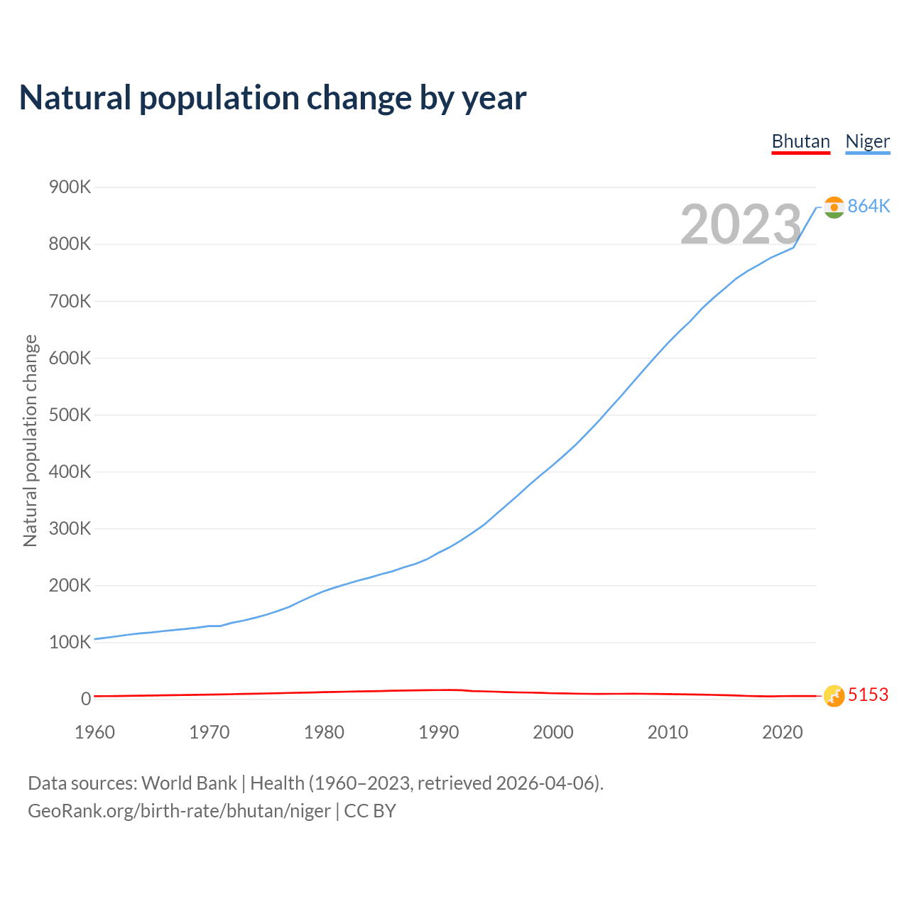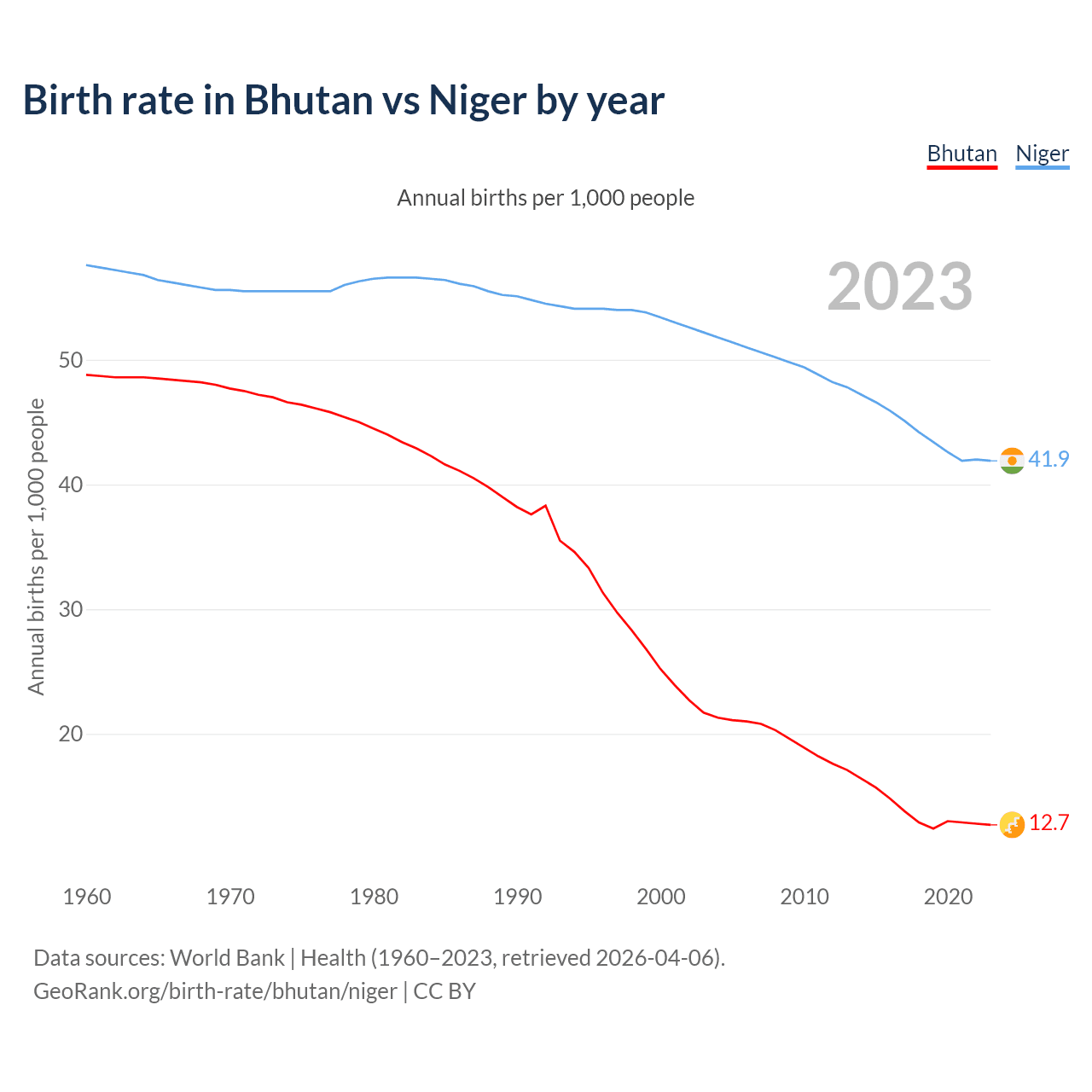 Bhutan has an annual birth rate of 12.7 births per 1,000 people, compared to 41.9 for Niger. The average number of children a woman is expected to have during her lifetime — the fertility rate, is 1.46 in Bhutan and 6.06 in Niger — 315% difference.