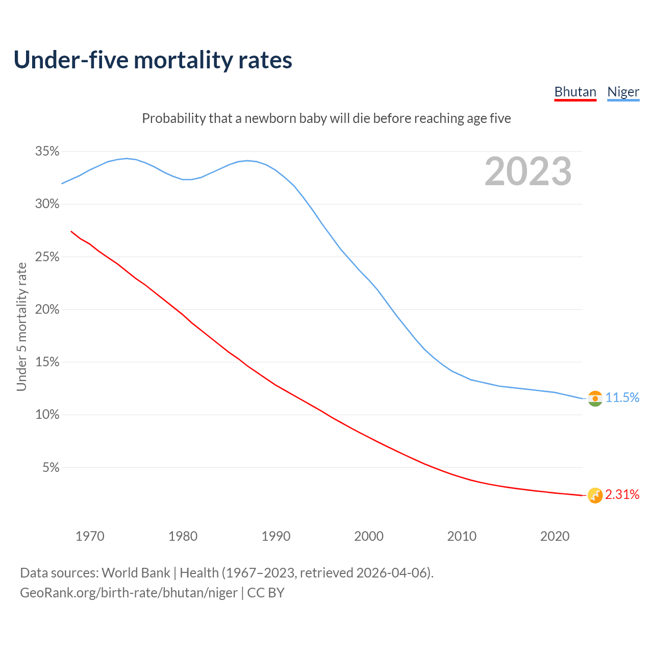 The chance that a newborn baby will die before reaching age five is 2.31% in Bhutan and 11.5% in Niger. Above is a chart with historical data on under-five mortality rates.