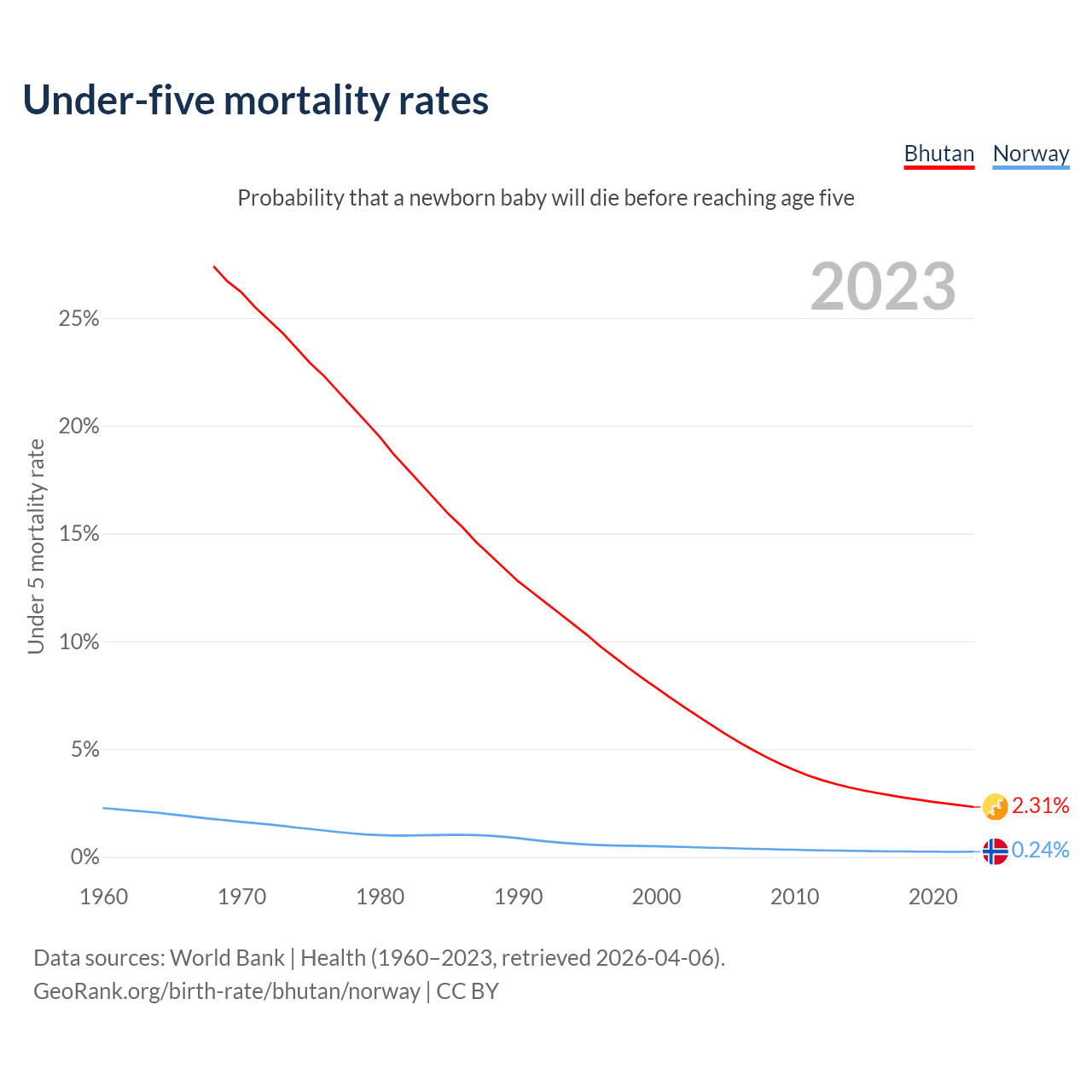 The chance that a newborn baby will die before reaching age five is 2.31% in Bhutan and 0.24% in Norway. Above is a chart with historical data on under-five mortality rates.