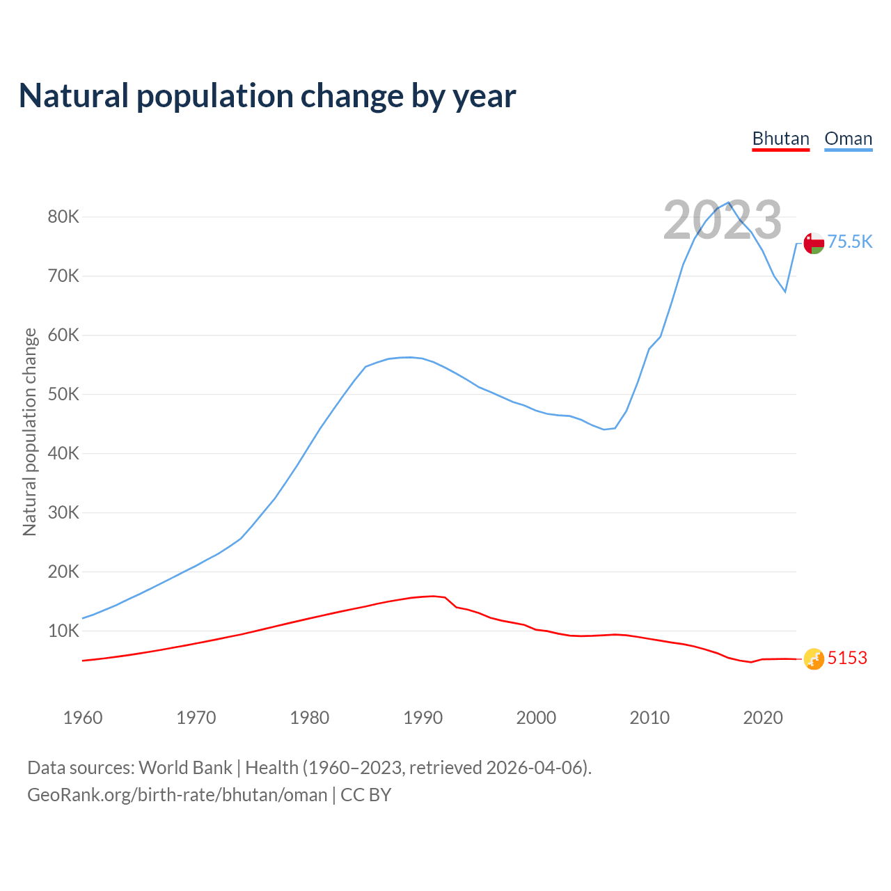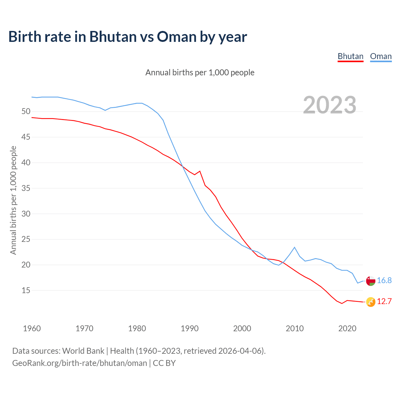 Bhutan has an annual birth rate of 12.7 births per 1,000 people, compared to 16.8 for Oman. The average number of children a woman is expected to have during her lifetime — the fertility rate, is 1.46 in Bhutan and 2.53 in Oman — 72.7% difference.