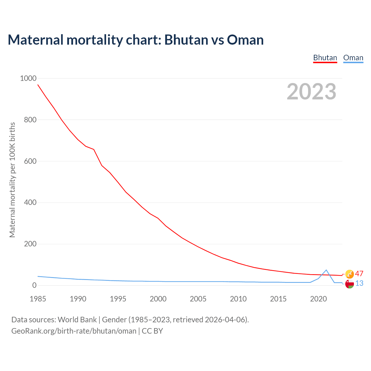 The maternal mortality rate, which is the probability of dying during childbirth or within 42 days of pregnancy termination, is 47 deaths per 100,000 live births in Bhutan, compared to 13 deaths in Oman.