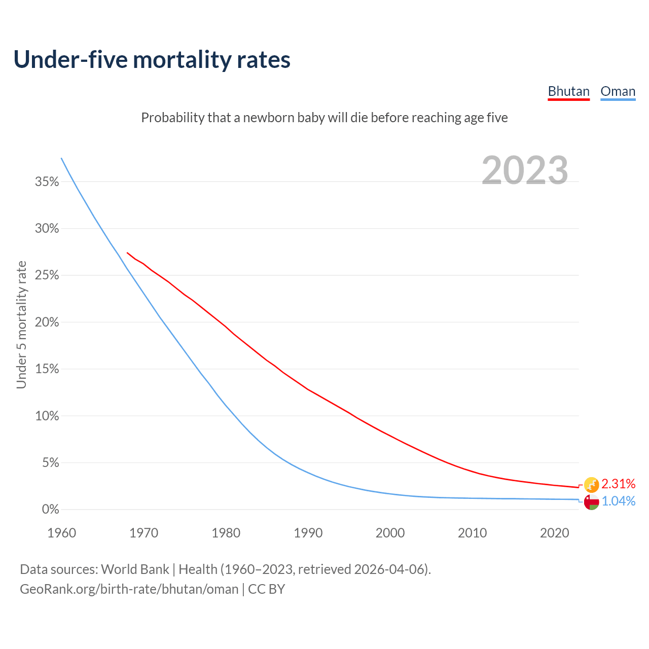 The chance that a newborn baby will die before reaching age five is 2.31% in Bhutan and 1.04% in Oman. Above is a chart with historical data on under-five mortality rates.