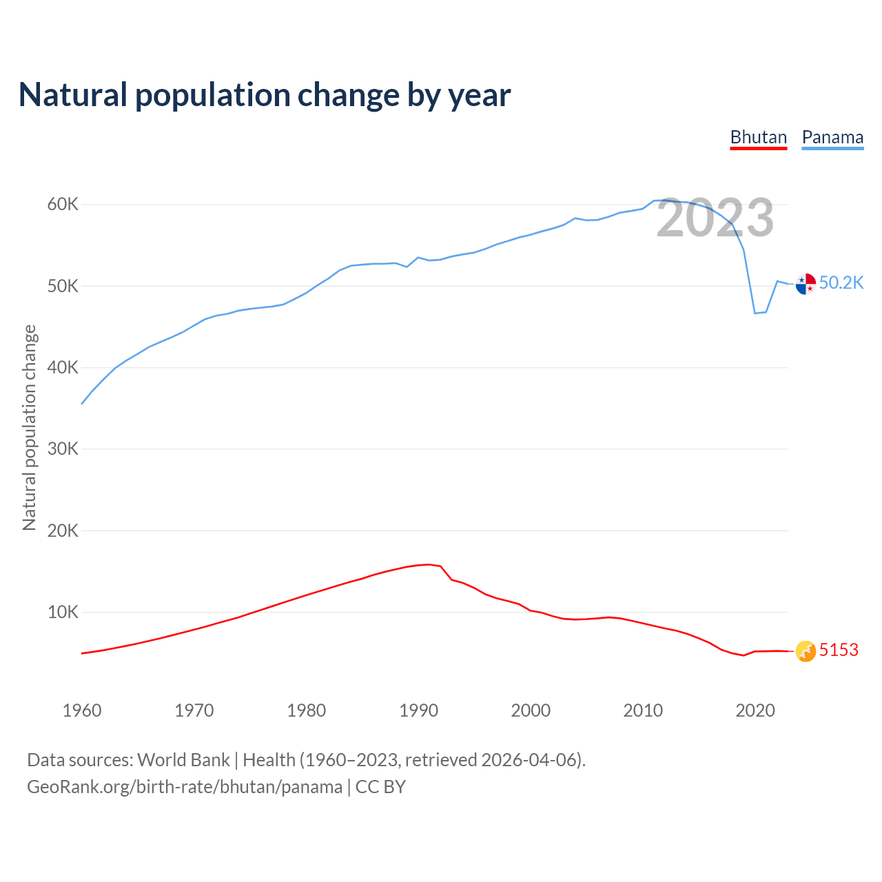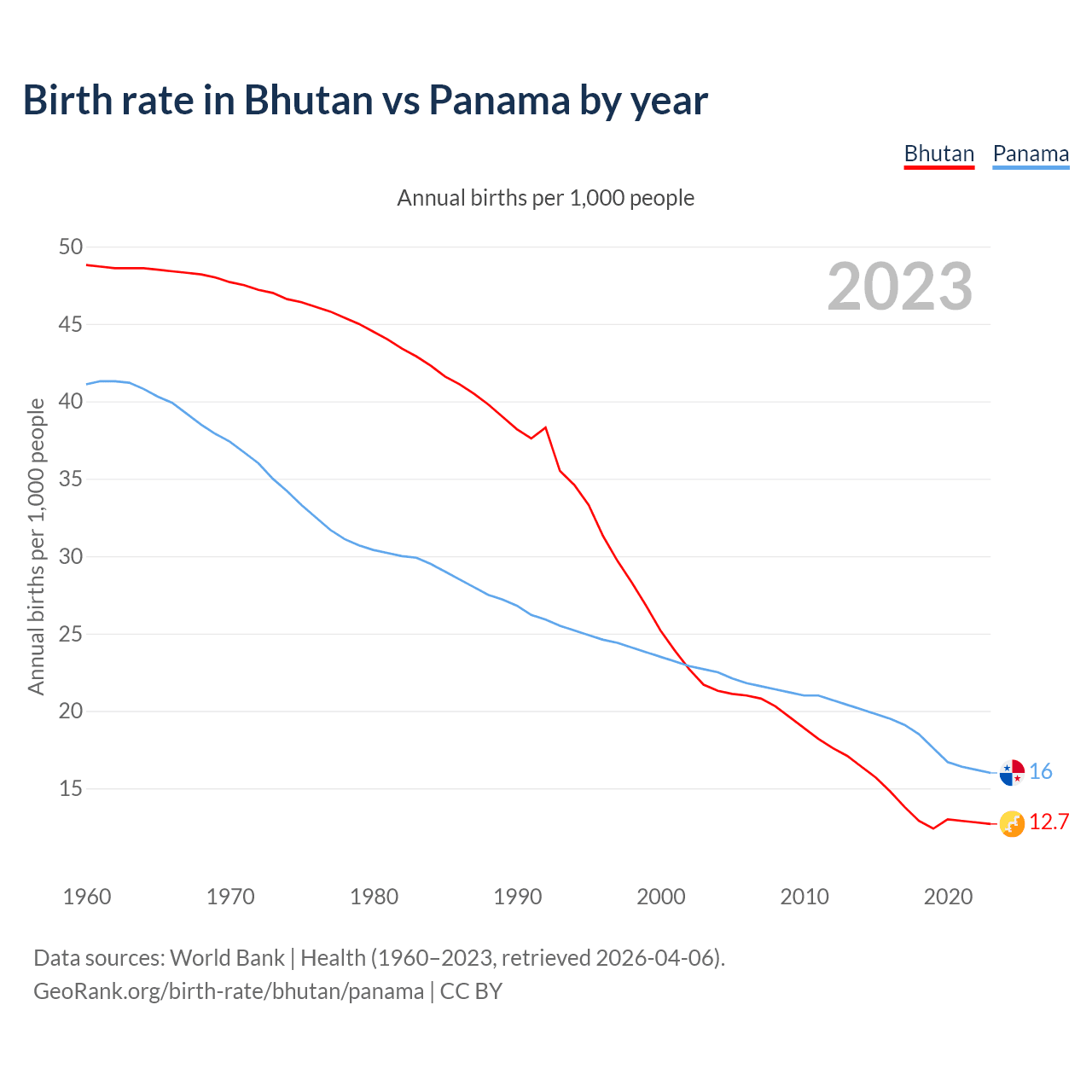 Bhutan has an annual birth rate of 12.7 births per 1,000 people, compared to 16 for Panama. The average number of children a woman is expected to have during her lifetime — the fertility rate, is 1.46 in Bhutan and 2.12 in Panama — 44.9% difference.