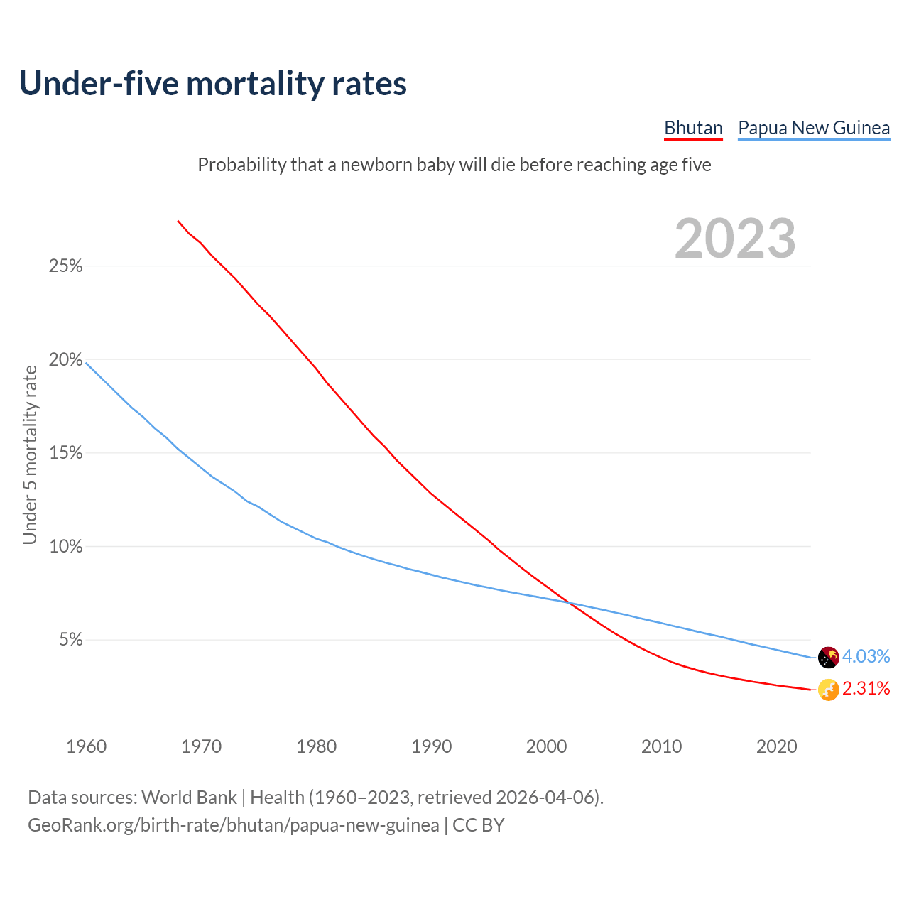 The chance that a newborn baby will die before reaching age five is 2.31% in Bhutan and 4.03% in Papua New Guinea. Above is a chart with historical data on under-five mortality rates.