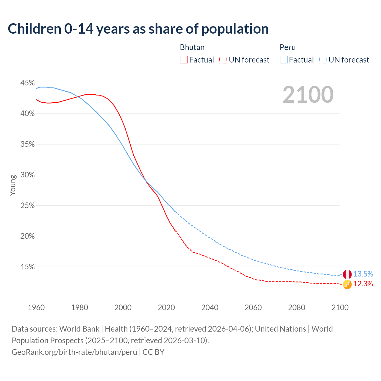 According to the latest available data on birth rates, the fertility rate in Bhutan was 1.46 children per woman in 2023, compared to 1.98 in Peru in 2023. The replacement level is considered to be 2.1 children per woman.