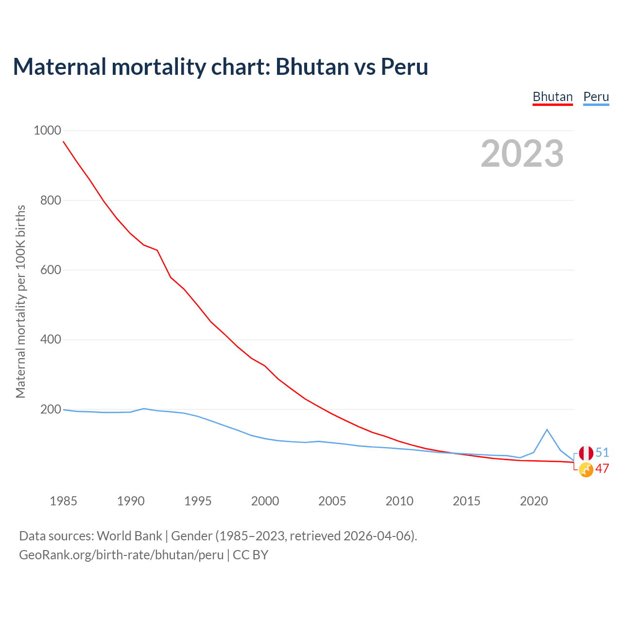 The maternal mortality rate, which is the probability of dying during childbirth or within 42 days of pregnancy termination, is 47 deaths per 100,000 live births in Bhutan, compared to 51 deaths in Peru.