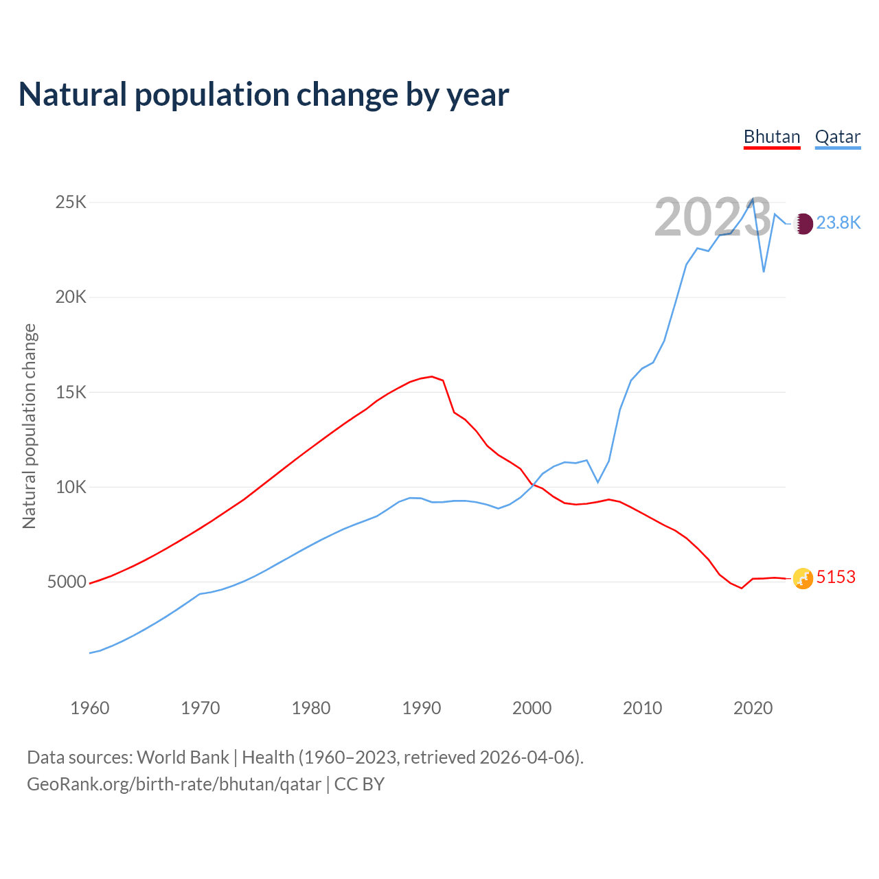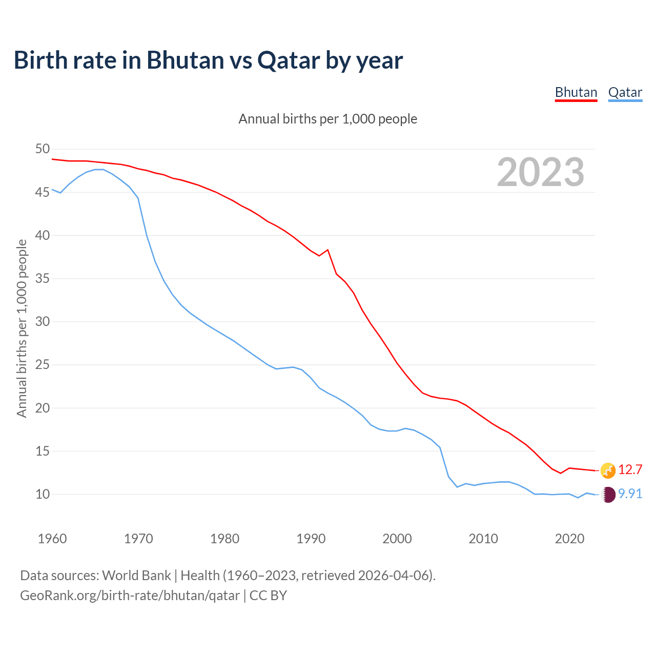 Bhutan has an annual birth rate of 12.7 births per 1,000 people, compared to 9.91 for Qatar. The average number of children a woman is expected to have during her lifetime — the fertility rate, is 1.46 in Bhutan and 1.73 in Qatar — 18.3% difference.