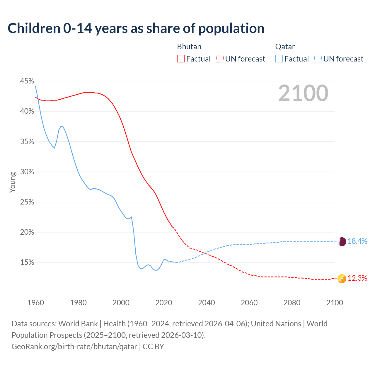 According to the latest available data on birth rates, the fertility rate in Bhutan was 1.46 children per woman in 2023, compared to 1.73 in Qatar in 2023. The replacement level is considered to be 2.1 children per woman.