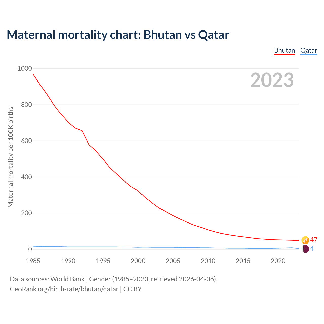 The maternal mortality rate, which is the probability of dying during childbirth or within 42 days of pregnancy termination, is 47 deaths per 100,000 live births in Bhutan, compared to 4 deaths in Qatar.